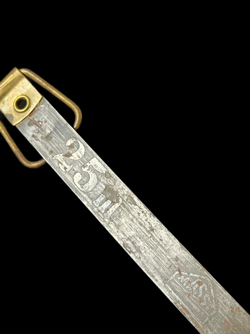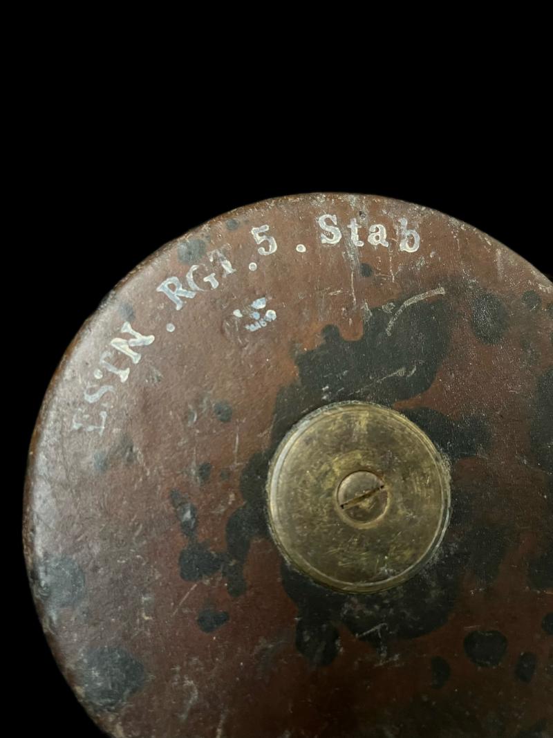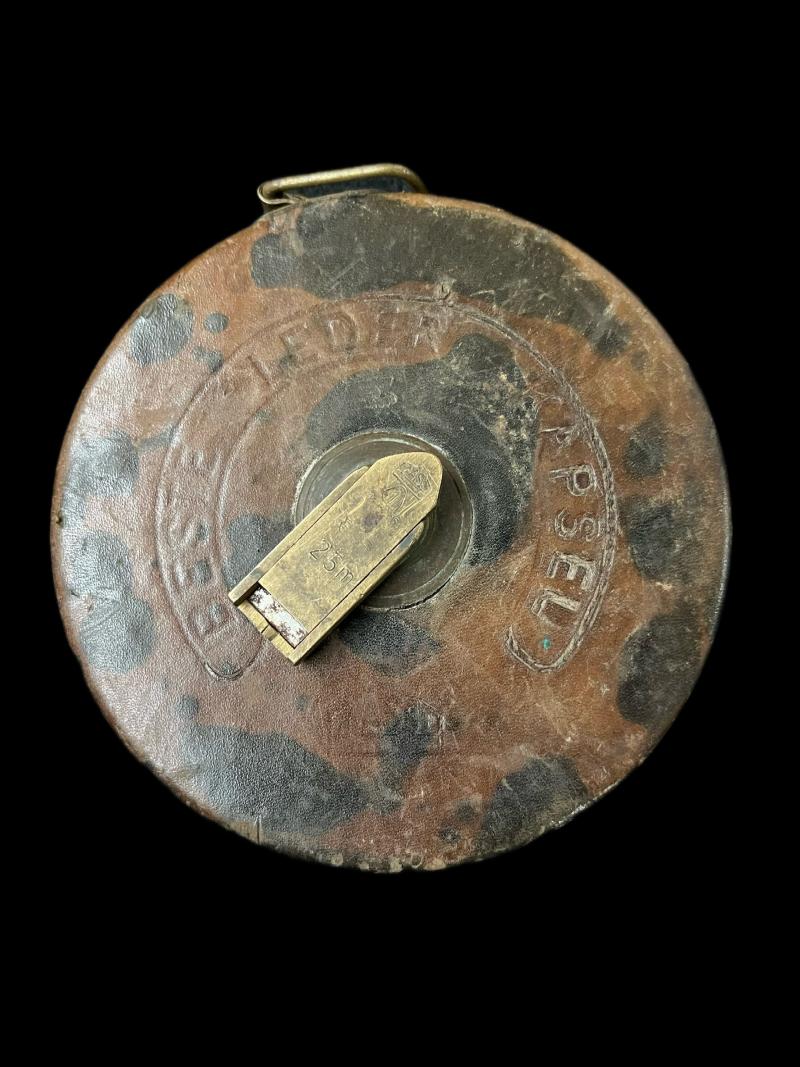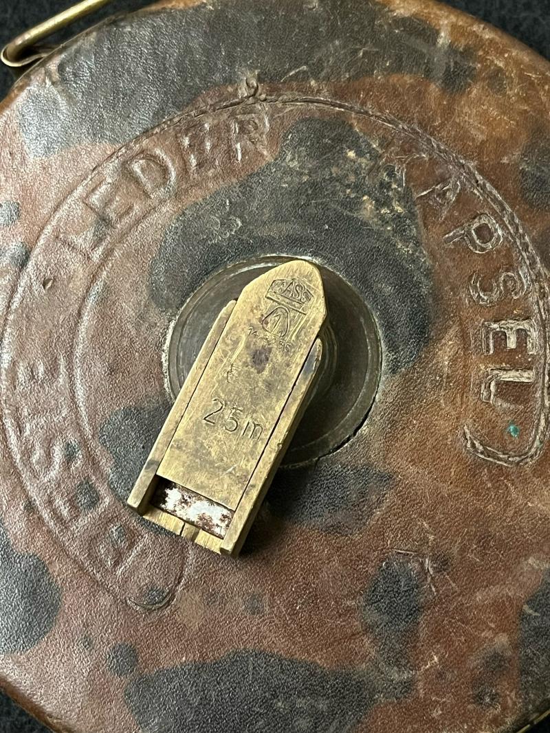 This is a very nice WW2 German Measure Tape 25m MASSI Beste Leder Kapsel ESTN RGT5 STAB, with its leather outer casing and clear markings.