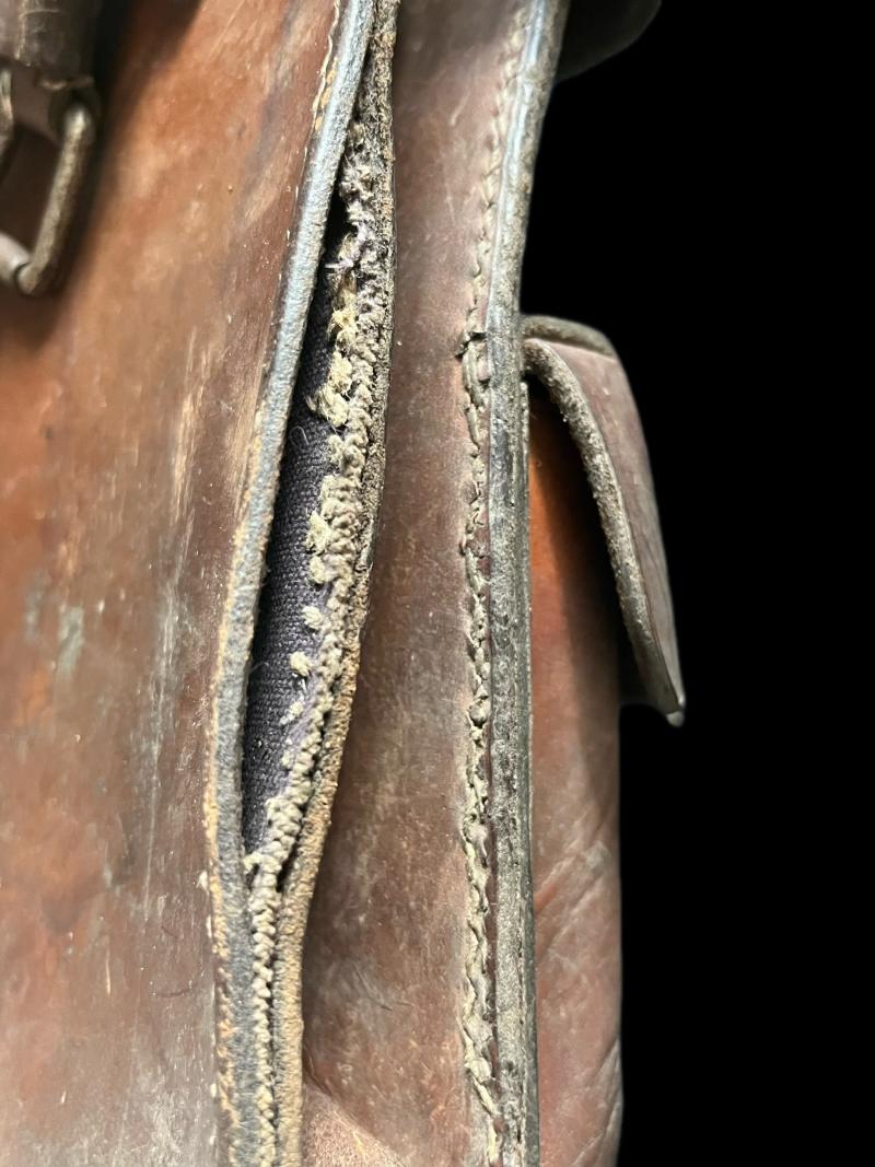 This is a German/Austrian leather patrol pouch, around from the 50s. there is a split in the stitching down the side and the top leather fastener is missing.