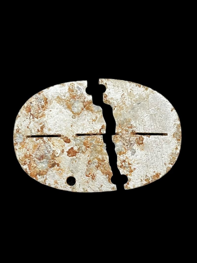 This is a WW2 German dog tag which has split in half. Check out our YouTube channel below. https://m.youtube.com/results?sp=mAEA&search_query=chase+militaria+