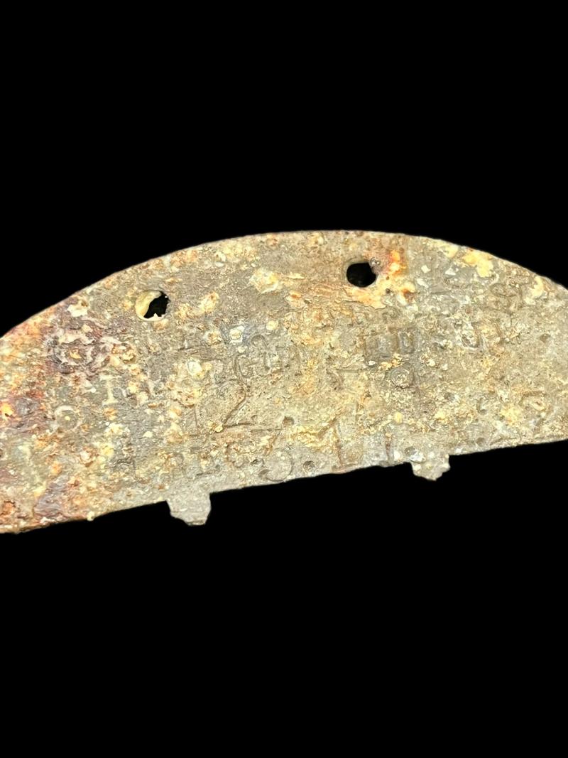 This is a WW2 German dog tag with some writing which is hard to make out. Found in Latvia Kurland Pocket. Check out our YouTube channel below. https://m.youtube.com/results?sp=mAEA&search_query=chase+militaria+