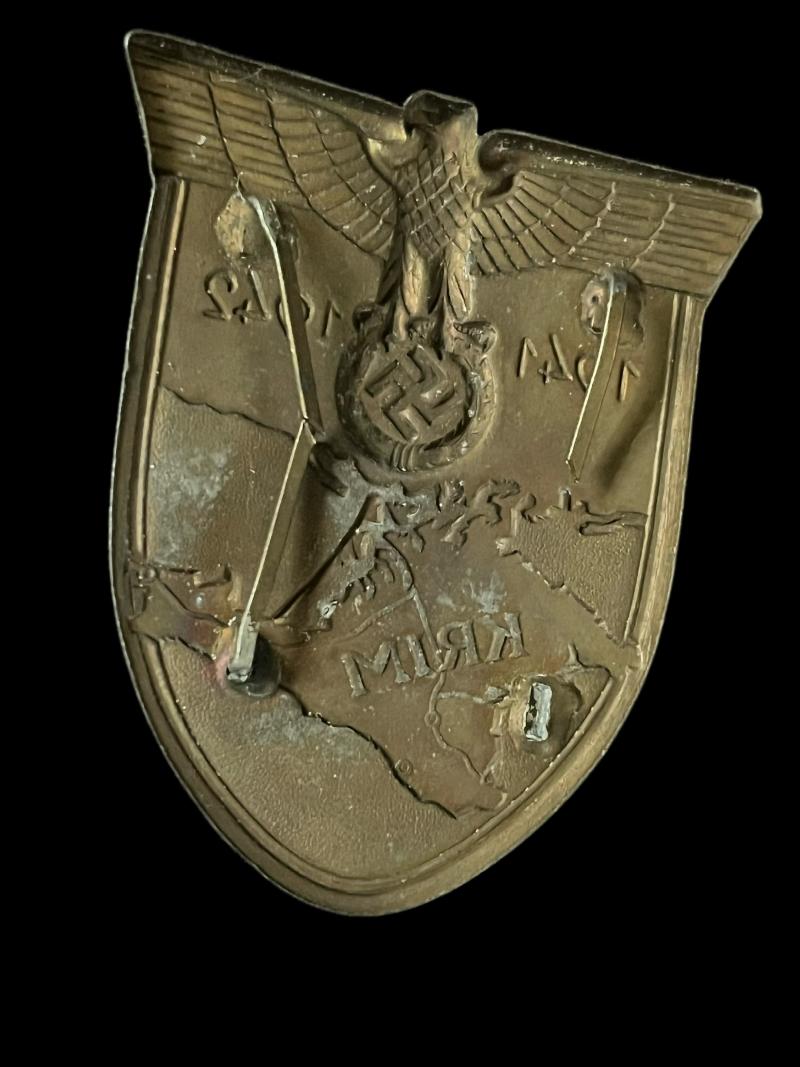 This is a WW2 German Krim Shield which is missing one of its pins. Check out our YouTube channel below. https://m.youtube.com/results?sp=mAEA&search_query=chase+militaria+