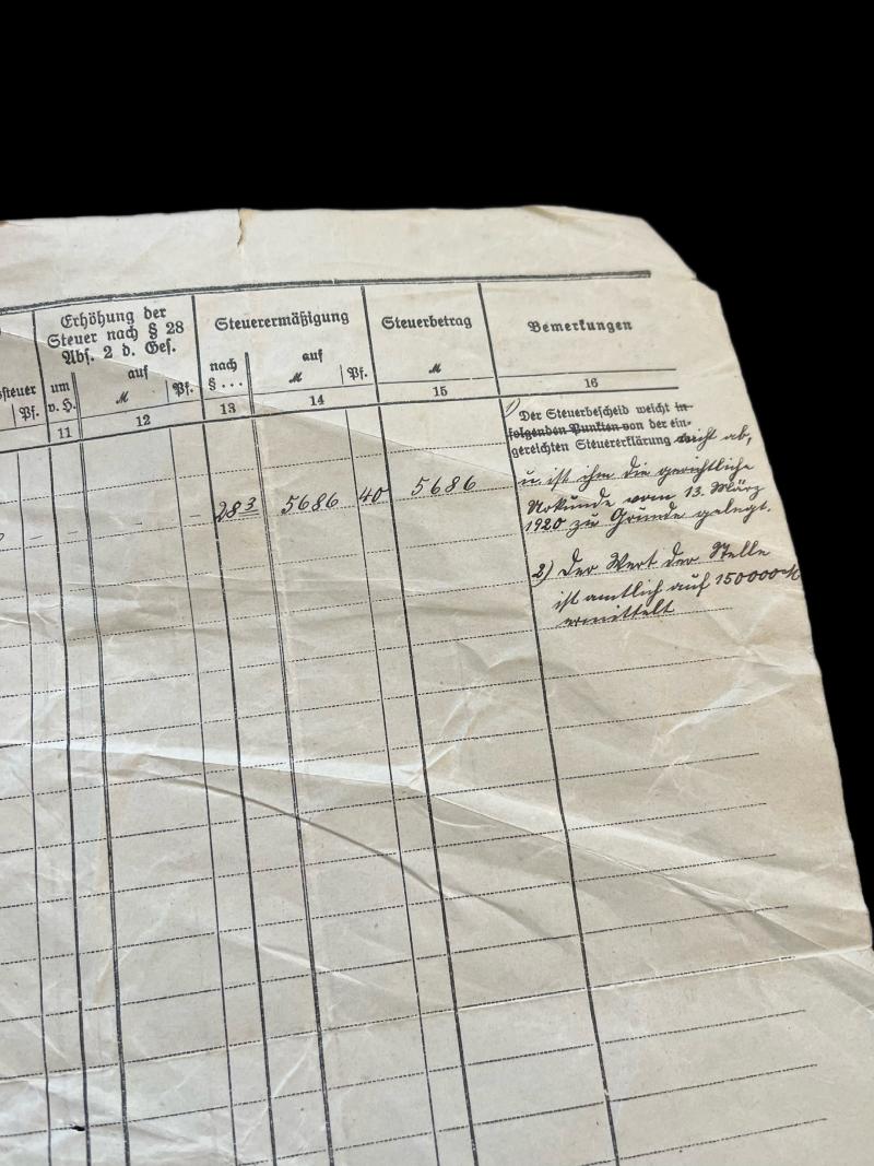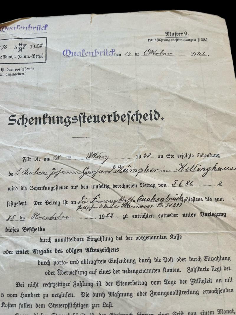 This is a 1922 dated German Tax Assessment document. Check out our YouTube channel below. https://m.youtube.com/results?sp=mAEA&search_query=chase+militaria+