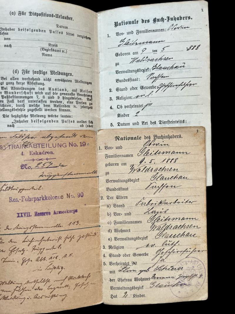 This is a set of WW1 German Military documents which belonged to the same person, Im struggling to make the name out though, its a Soldbuch and a Militar pas, it looks like he worked in the Train department 4 Squadron.