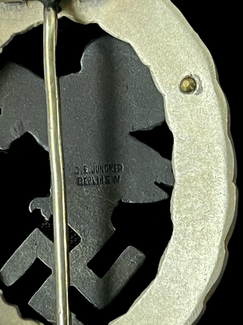 This is a very nice WW2 German Luftwaffe Observer’s Badge, manufactured by C.E. Juncker, Berlin. The oak and laurel leaf wreath retains its full silvered finish, while the dark patinated eagle remains completely intact, displaying superb depth and detail to the obverse. The reverse of the eagle is clearly marked C.E. Juncker, Berlin SW, and features two fine domed rivets securing it to the wreath. Complete with its original pin, hook, and hinge.