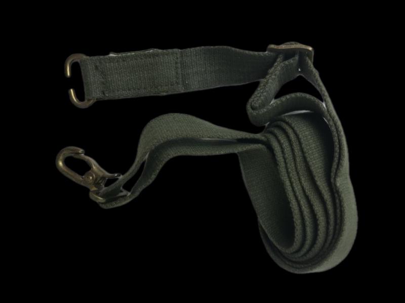 This is the rarer early webbing sling with brass fittings for the Sterling submachine gun. Later examples have steel fittings.