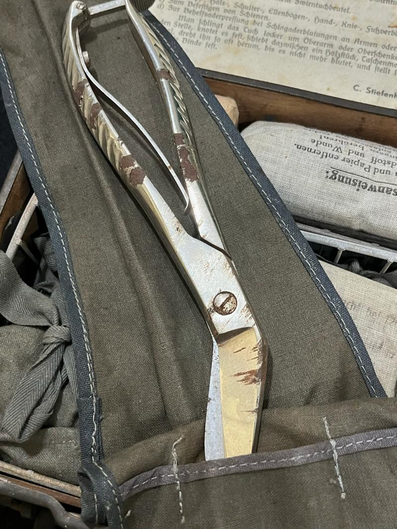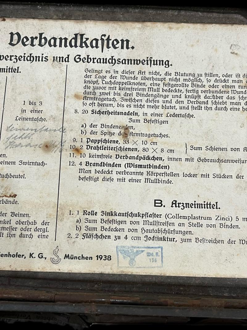 This is a nice Verbandkasten, the medical box, placed in every German military vehicle. This box is with most of its original paint, most of the stencilling and red cross to the exterior good and clear. Full of various medical implements, bandages dated WW2 period, with many other medical implements. To the upper inner lid the full list of compliments of the box and also the box has a Waffenamt stamp on the side.