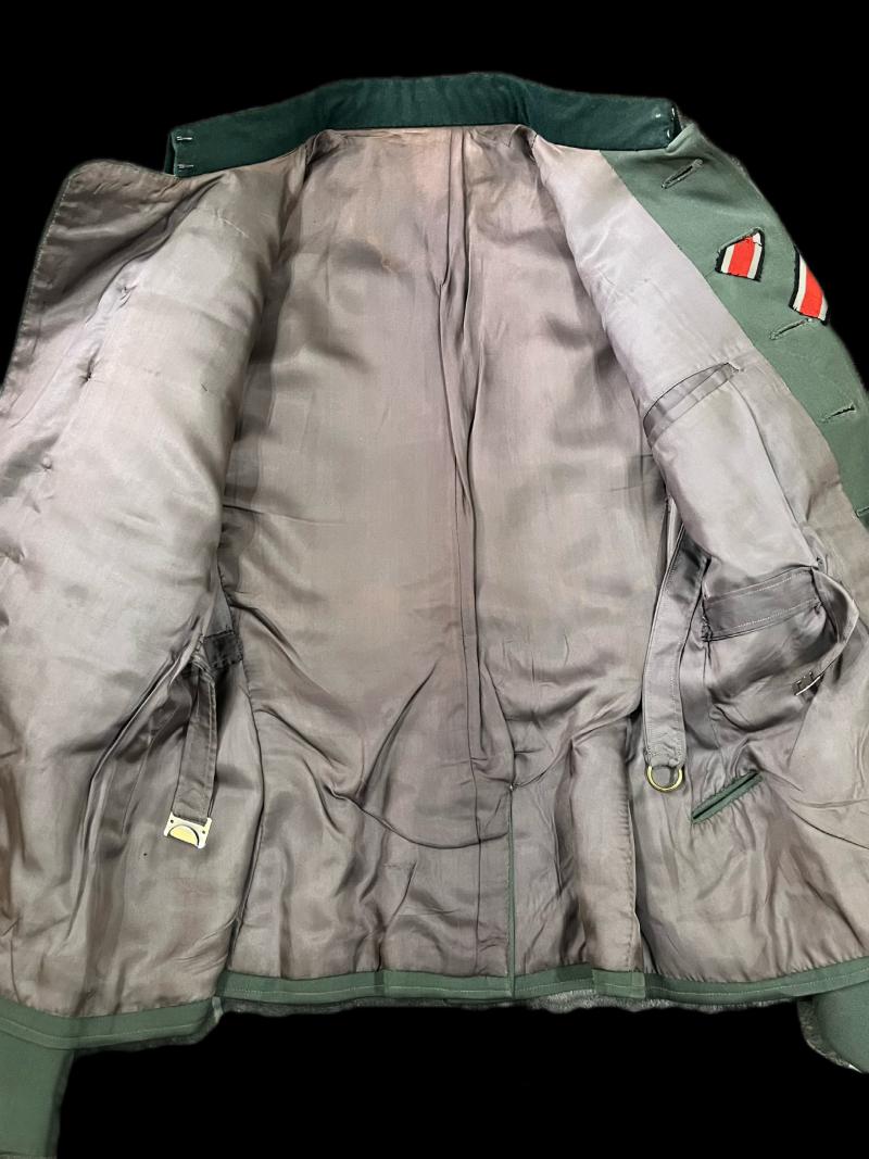 This is a very nice WW2 German SS-Standarte 3 Officer's Der Fuhrer 4 pocket tunic which has the SS 3 Collar tab and the rank of a Sturmbannfuhrer, the tunic is an Austrian cut so most likely worn by an Austrian Officer, fitted with its Iron Cross ribbon, SS Infantry shoulder boards and its SS Sleeve eagle, although the cuff title has been removed, the tunic still has its award loops to the left side, complete with all its buttons, the tunic is overall in great condition, although there are a couple of nicks, and the silk lining is overall in great condition, although it has had a couple of repairs to the inside stitching under the arm and down the side.