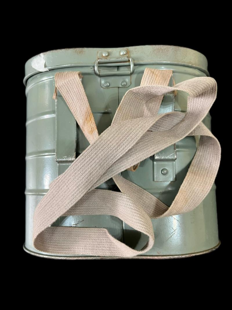 This is a nice Czech FM-3 gas mask with its filter and Fatra tin, the filter is dated 1937, the rubber on the mask in in great condition, the tin is also in decent condition with its carry strap.