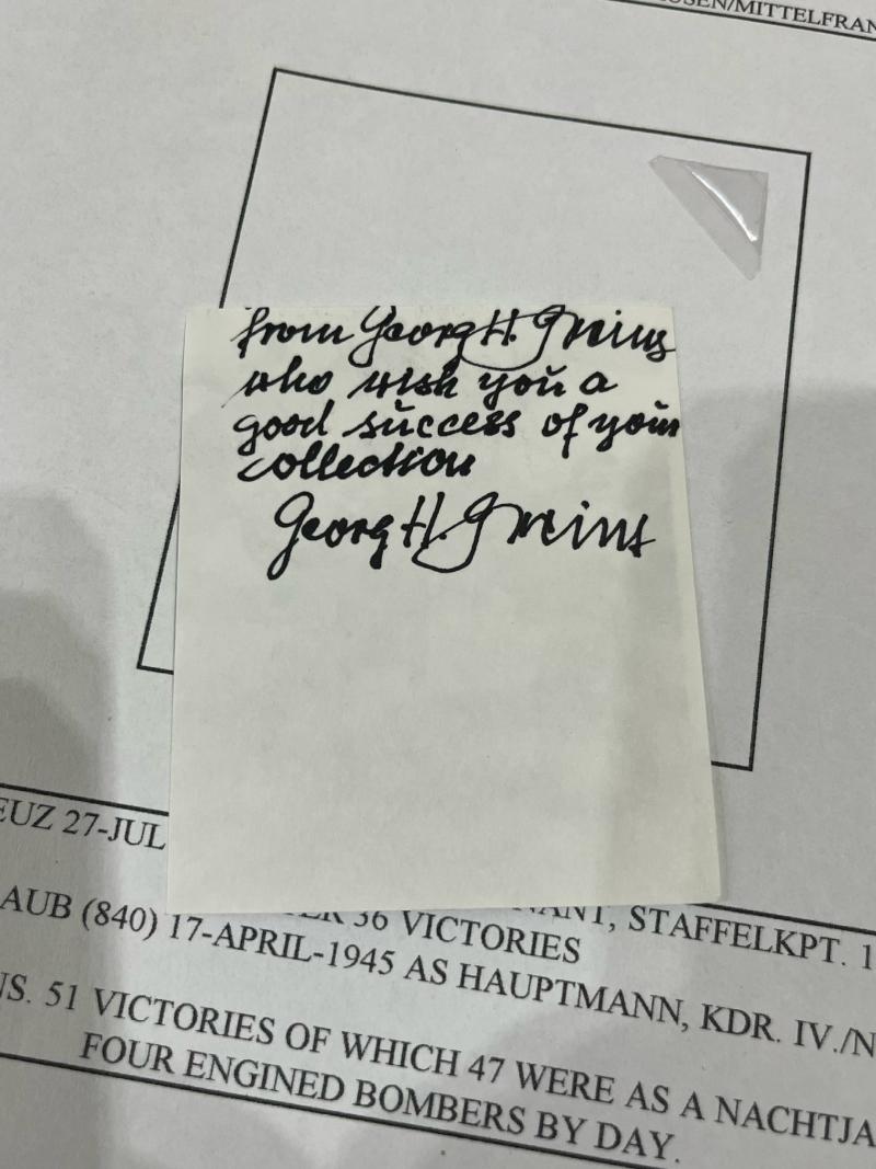This is a signature and note from WW2 German Luftwaffe pilot Hauptmann Hermann Greiner.