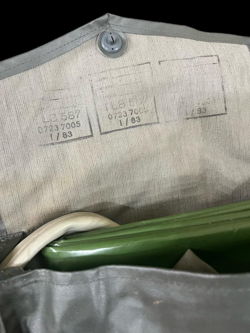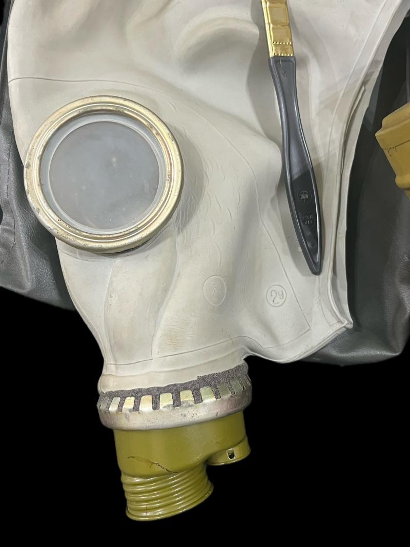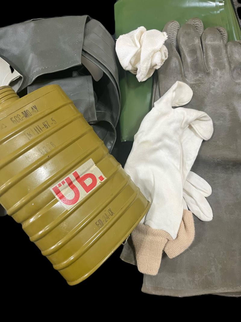 This is a very nice East German Gas Mask set with a Soviet GP-5 Gas Mask, the mask looks to be in a size 2, the set also comes with inner and outer gloves, a cape, a brush and filter.