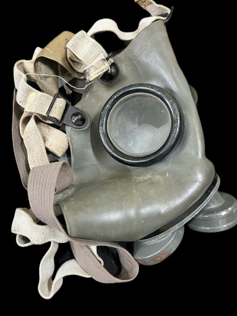 This is a Yugoslavian M-1 Gas Mask with its bag, the mask is in good condition with soft rubber, the bag is missing one button.