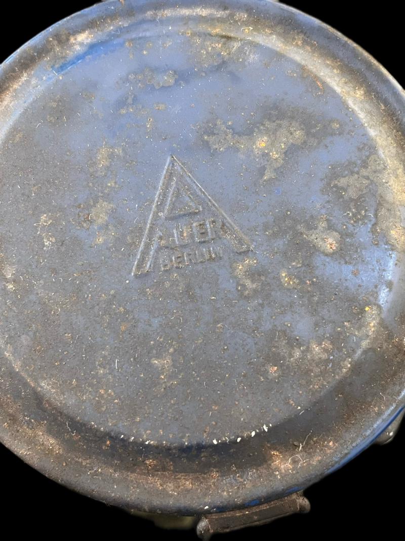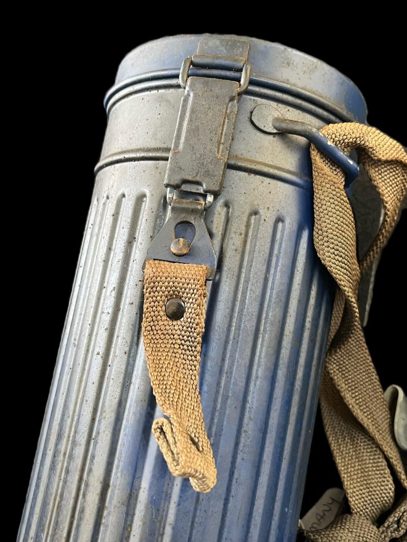 This is a German GM54 Gas Mask with its filter and tin, the mask is a size 3 and in good condition. The blue tin has some sort of dark staining to it.