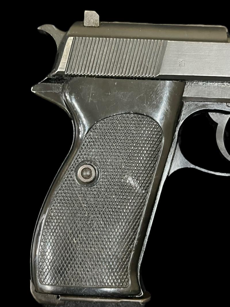 This is a deactivated Walther P1 pistol which is the post-war version of wartime P38, This one has a nice Walther P1 magazine to match as well, This one was deactivated in 2009 so it is able to strip, cock and dry fire, The barrel locking lug has been removed during the deactivation process. The main difference between the P1 and P38 is the frame is made of a lightweight alloy and the side grip extends past the safety catch and black plastic grips. In fact early post-war examples retained the P38 designation however when officially excepted into the Bundeswehr the pistol was designated the P1 and continued to be used by the West Germany and Austria to the early 1990's. All post-war P38/P1 pistols where solely produced by Walther. This example is dated November 1982 ( 11/82 ) and stamped 'BW" for Bundeswehr. UK sales only.