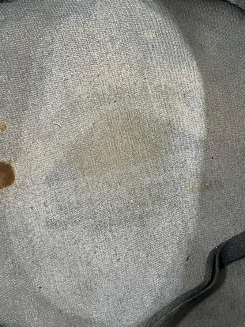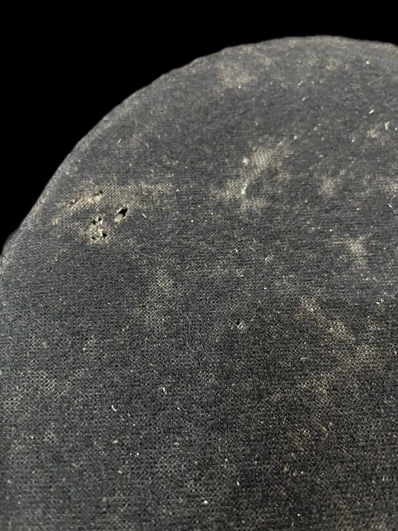 This is a worn WW2 Royal Navy H.M.S Sailors hat with its H.M.S Cap tally, there is some moth damage and tracking to this cap and some wear around the edge, still maintains its chin strap and can make out the faint makers on the liner. I would guess about a size 54.