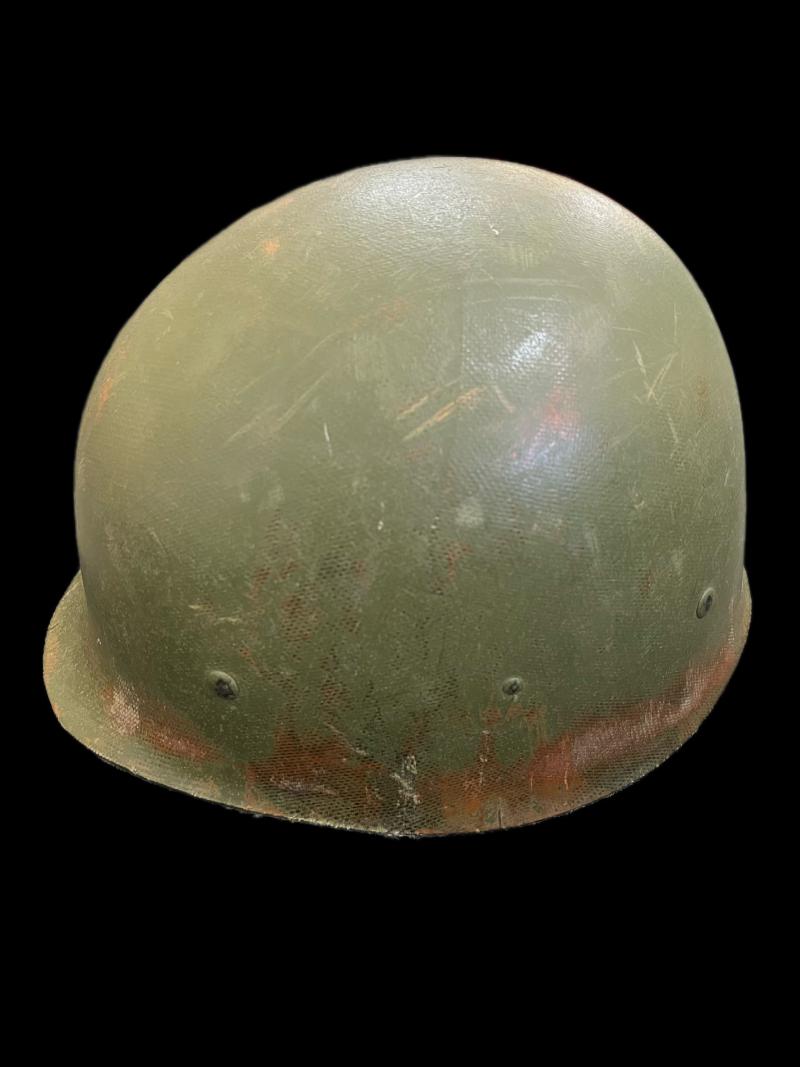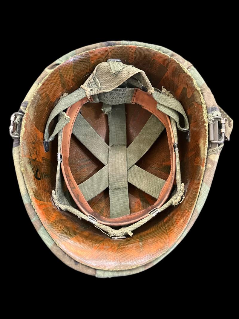This is a U.S. M1 Helmet with a 1974 dated liner, complete with chin strap and a Woodland camo helmet cover.
