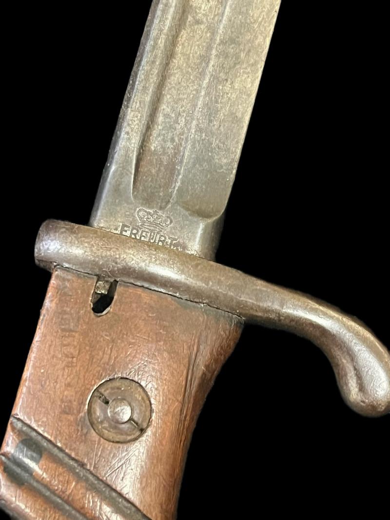 This is a nice WW1 German S98 bayonet and scabbard which is also fitted with a original leather frog, the blade has the makers Erfurt and the Regimental markings G.J.R. 57, with a nice original scabbard, although there seems to be something blocking the blade from going all the way down as seen in the picture the blade is sticking out by 1.5cm. This is an age restricted item. Proof of age must be provided. A photograph of your drivers licence or passport must be provided. U.K. Sales Only.