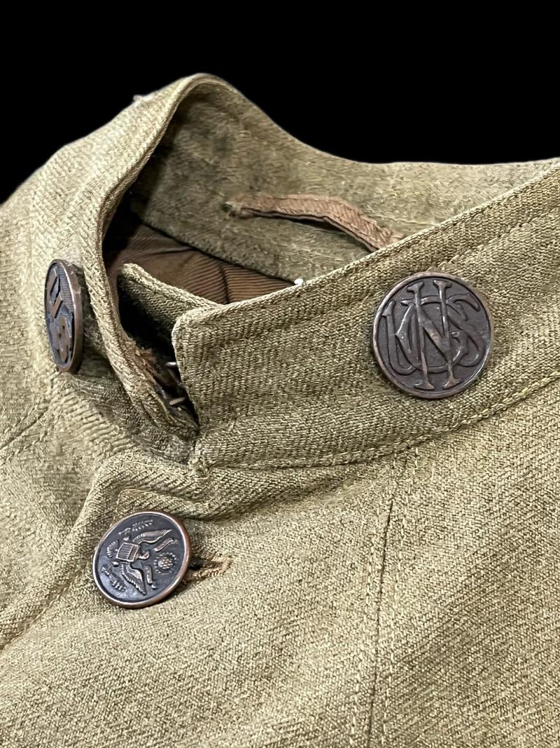 This is a nice WW1 U.S. National Guard tunic fitted with all correct buttons and the National Guard Button on the collar, this tunic is in great condition and looks like its hardly been worn. Approx. 36" chest and 18" under the arm.