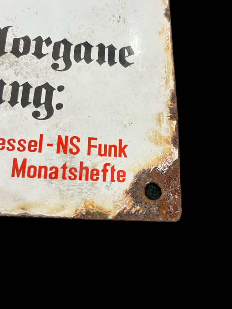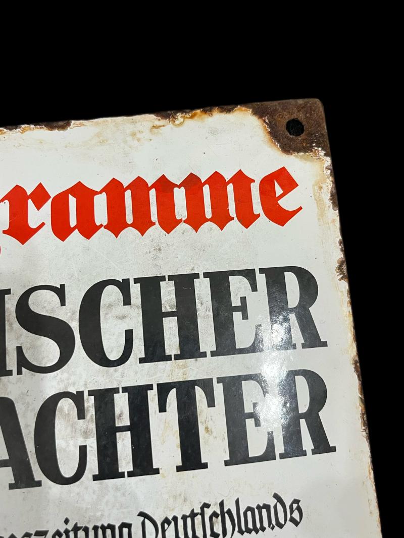 This is a very nice reproduction WW2 German News Paper proper gander enamel sign Volkischer Beobachter. Approx. 30cm in height and 20cm wide.
