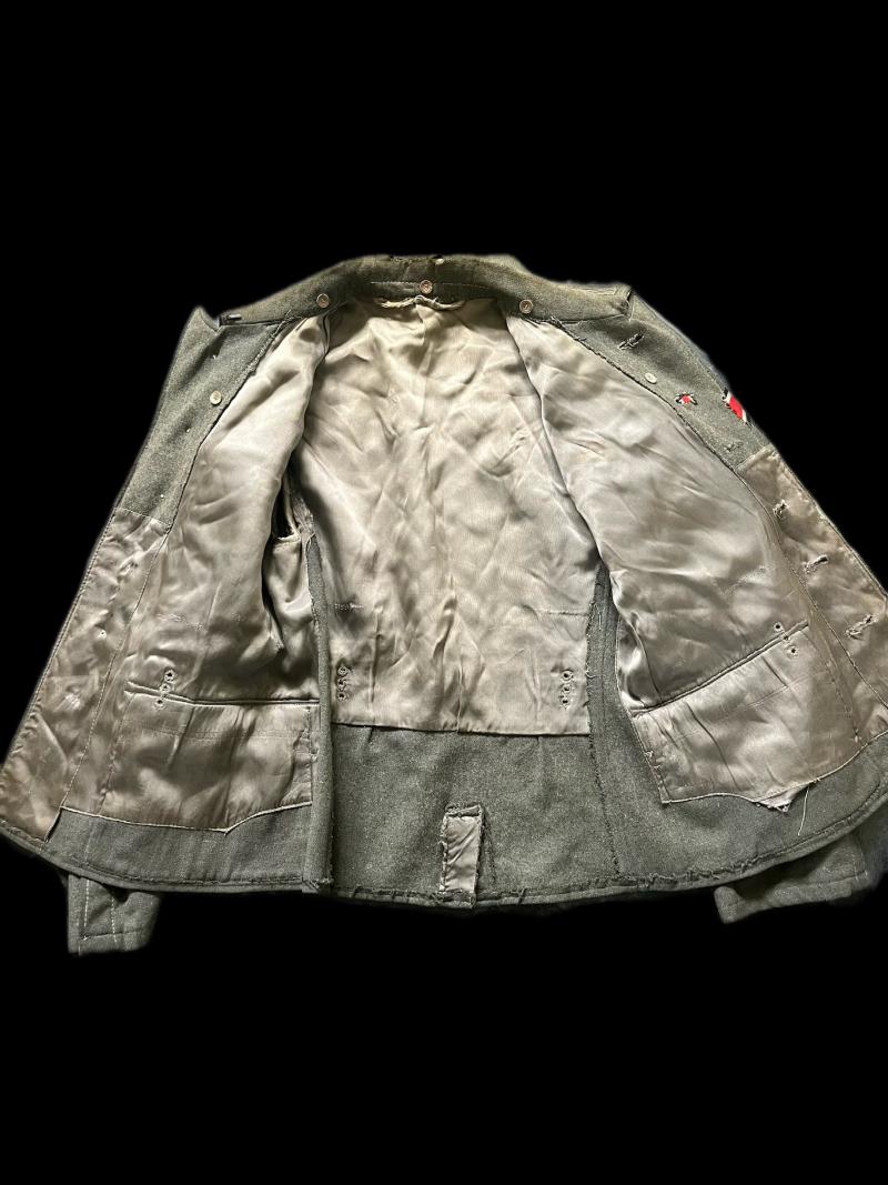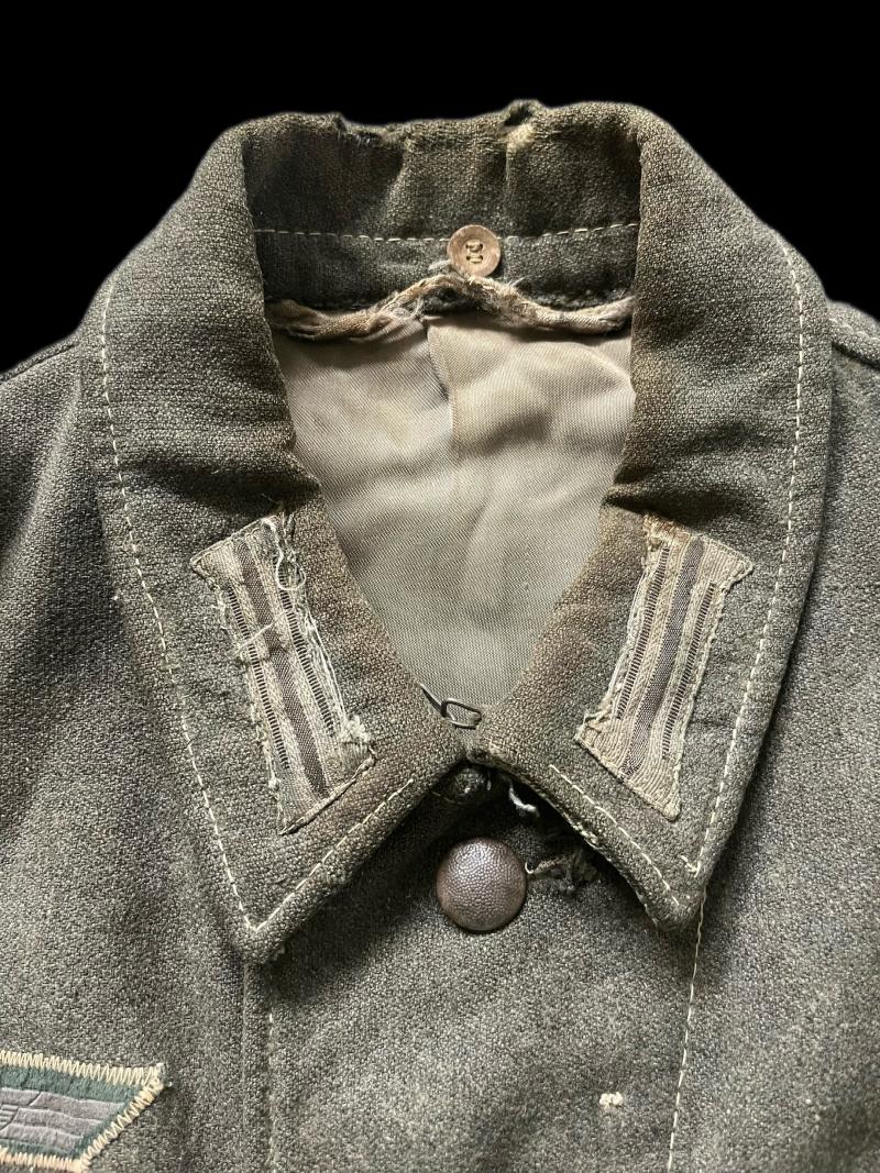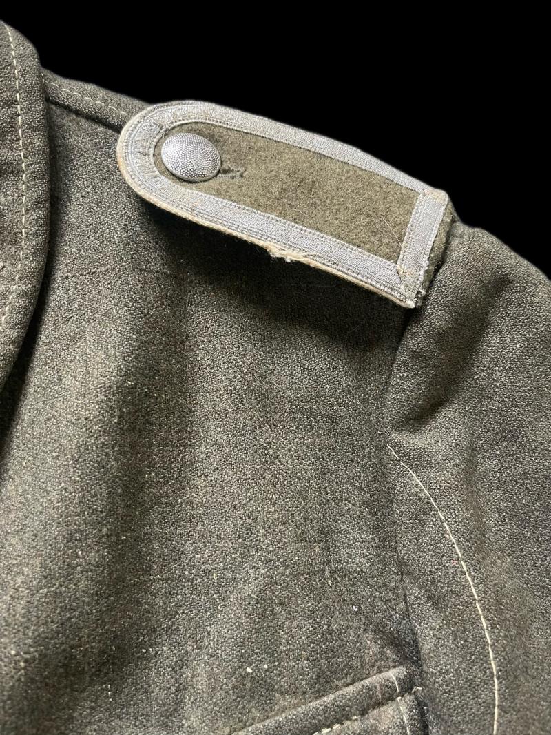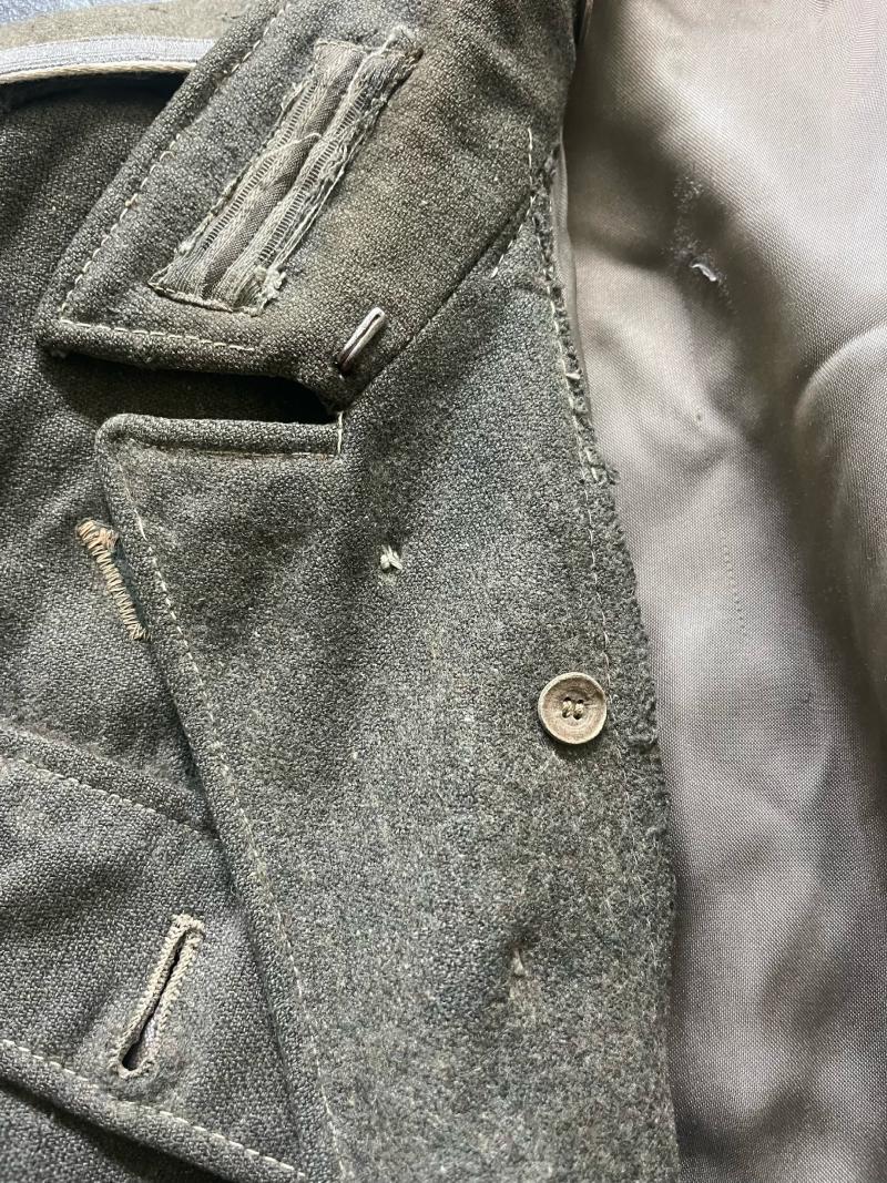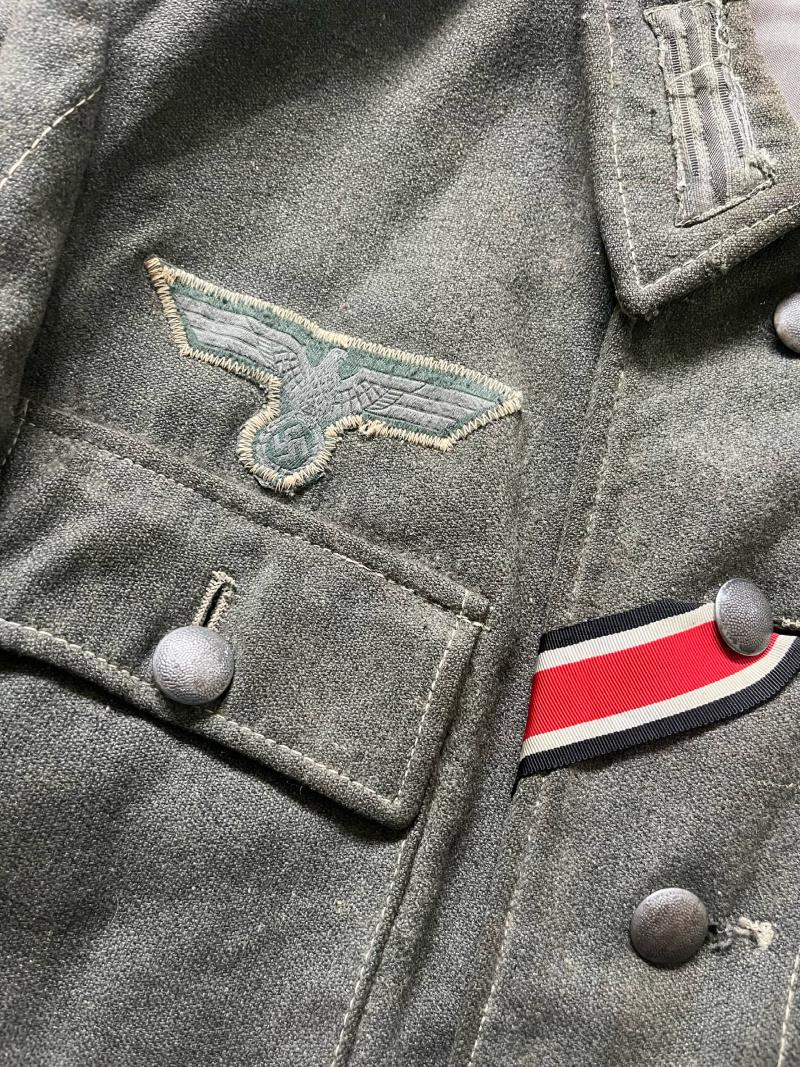 This is a nice worn WW2 German Heer Infantry NCO's Feldbluse tunic, with its original collar patches, slip on shoulder boards and original machine stitched breast eagle, all buttons complete, can still make out the original ink stamping on the inside, Approx. 36" chest and 16" under the arm. There is wear around the tunic as can be seen on the button holes, around the collar, but overall the tunic is in great condition and would make a fantastic display piece.