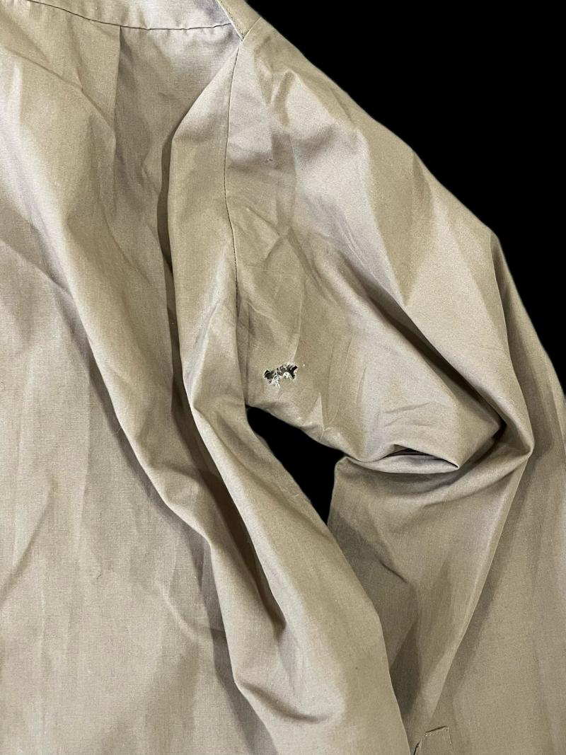 This is a British Woman's Khaki long sleeve shirt, there is a very small hole on the right sleeve by the armpit, size 34 collar and 88 bust.
