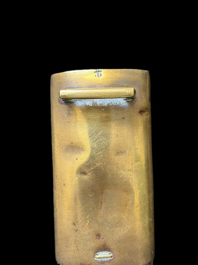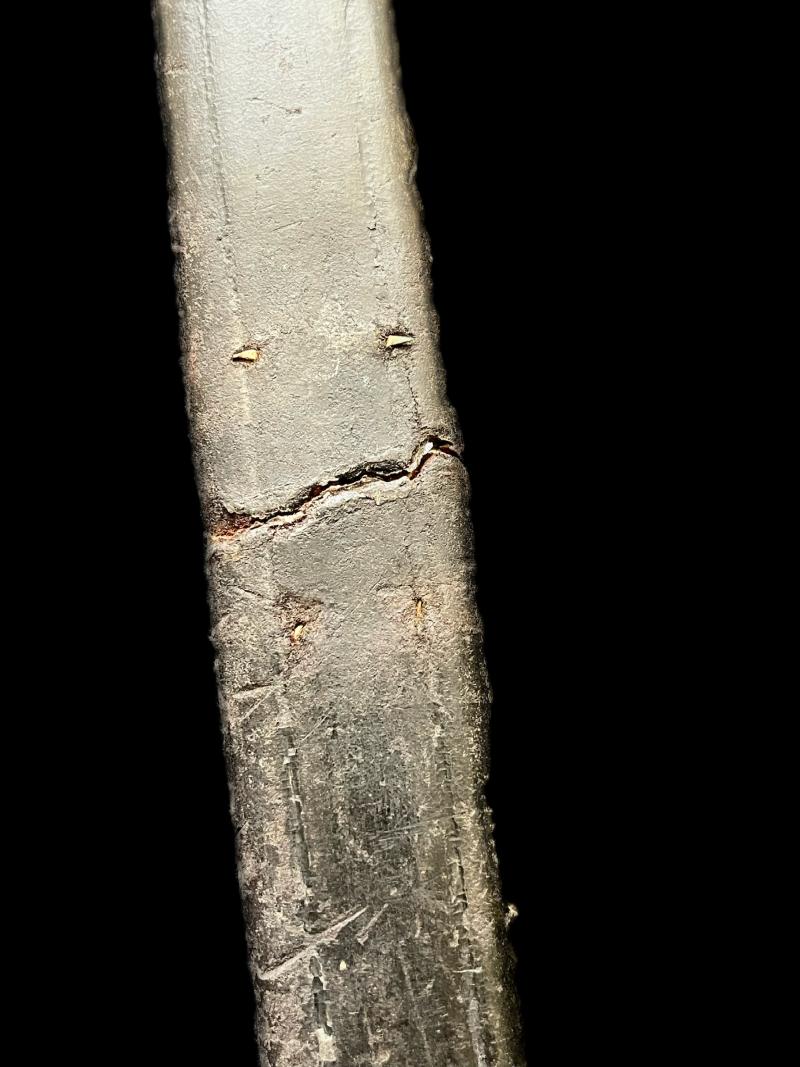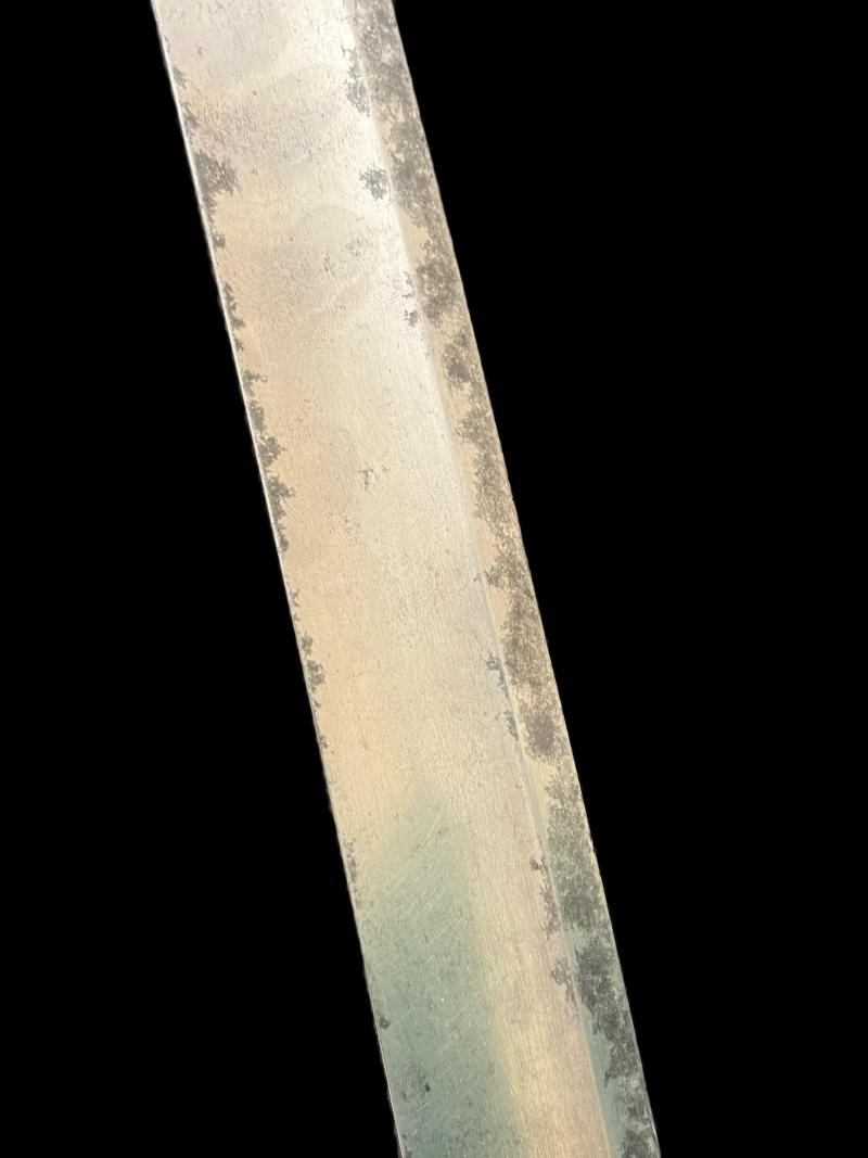 This is a French model 1833 naval cutlass, dated 1840. 1359 grams, 32.5" long, 26.5" long blade. French model 1833 navy cutlass dated 1840 with original leather scabbard (now repaired), both with French naval inspector's mark (an anchor on scabbard and an anchor and both sides of the blade); in pretty good condition for its age. Age Restricted Item. Proof of age must be provided. U.K. Sales Only.