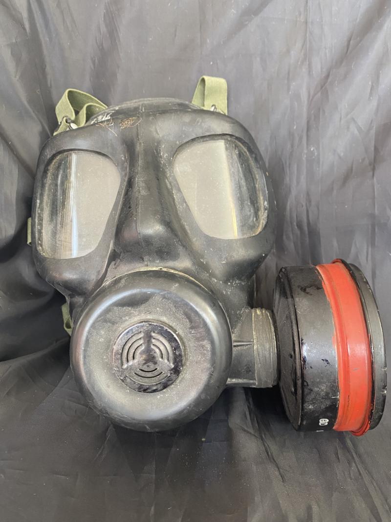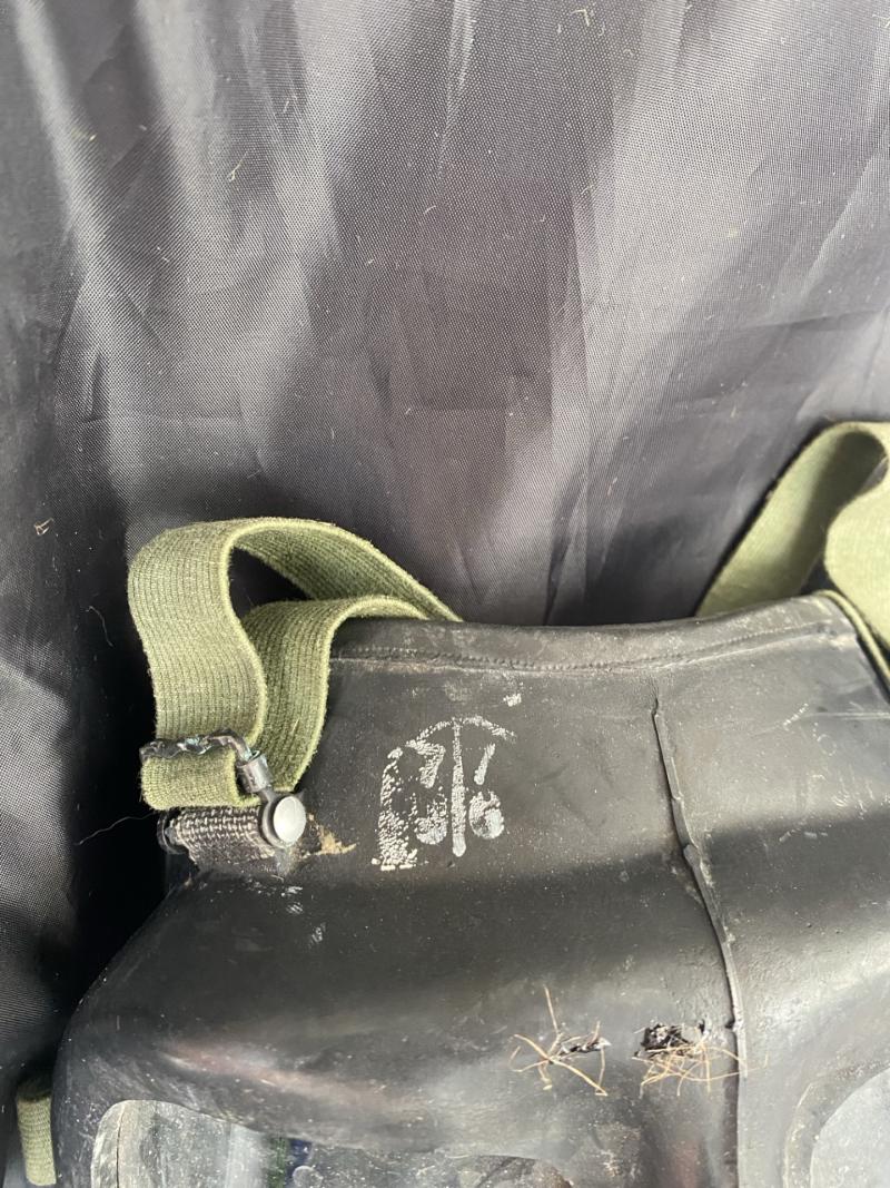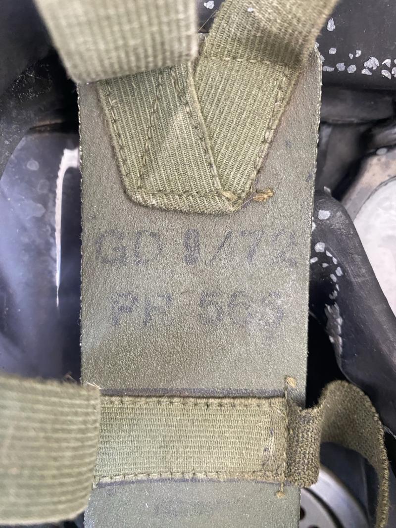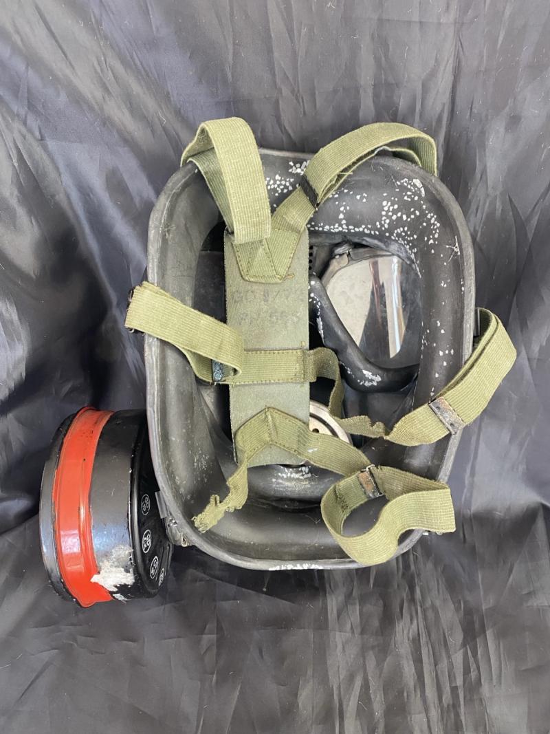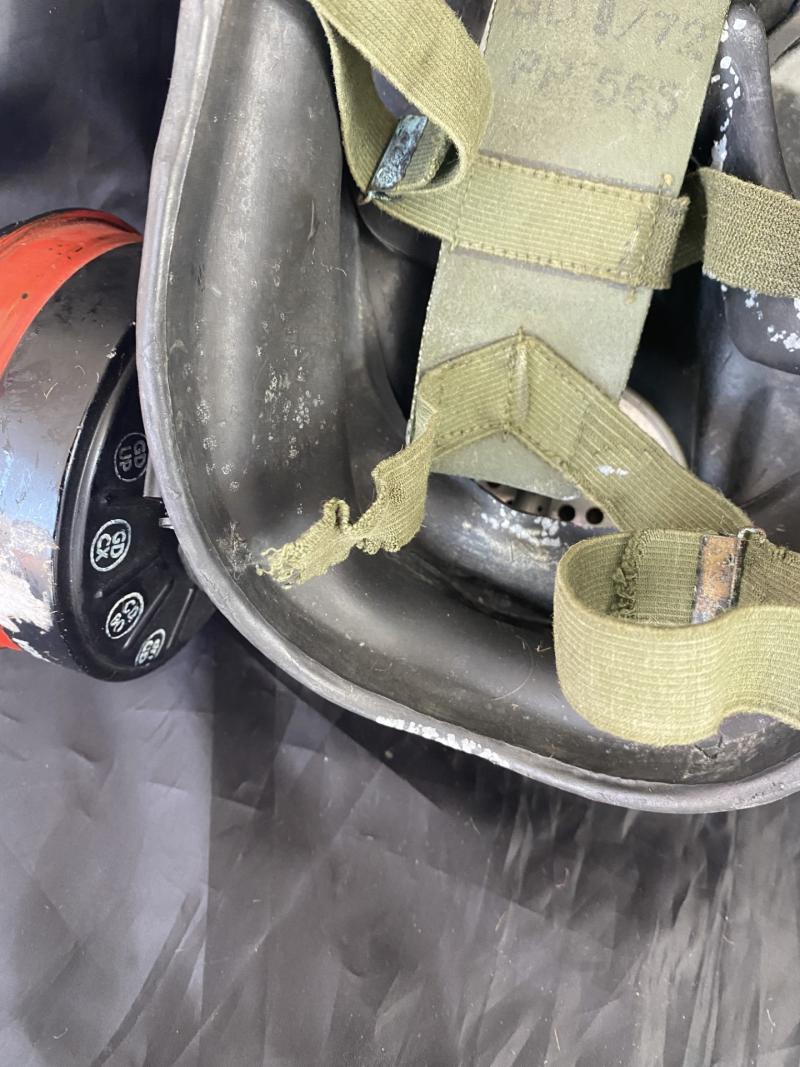 This is a British S6 gas mask, the mask itself is in good condition but the harness has came away at the bottom part, there are 2 stamps to the side one is 1971 L.B.R Co and the other is 72 SR6/2 CD. Display purposes only.