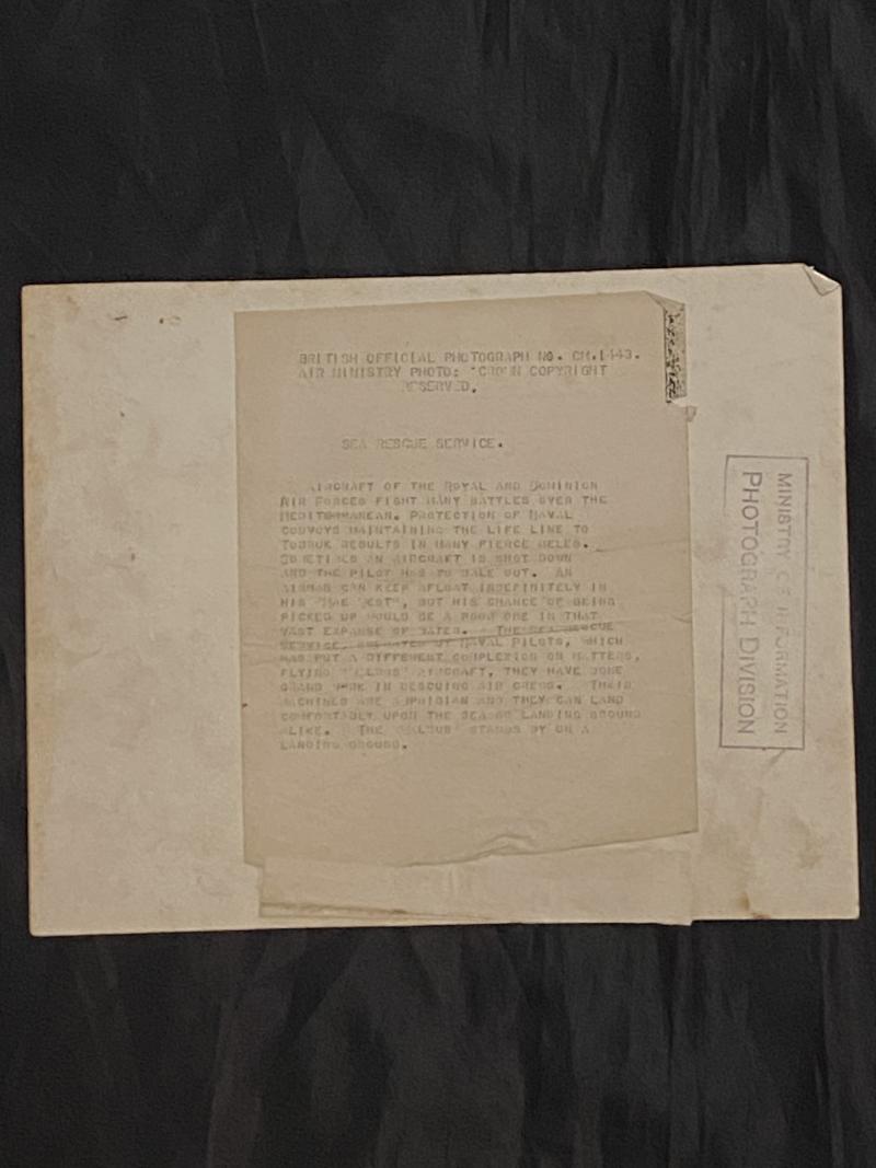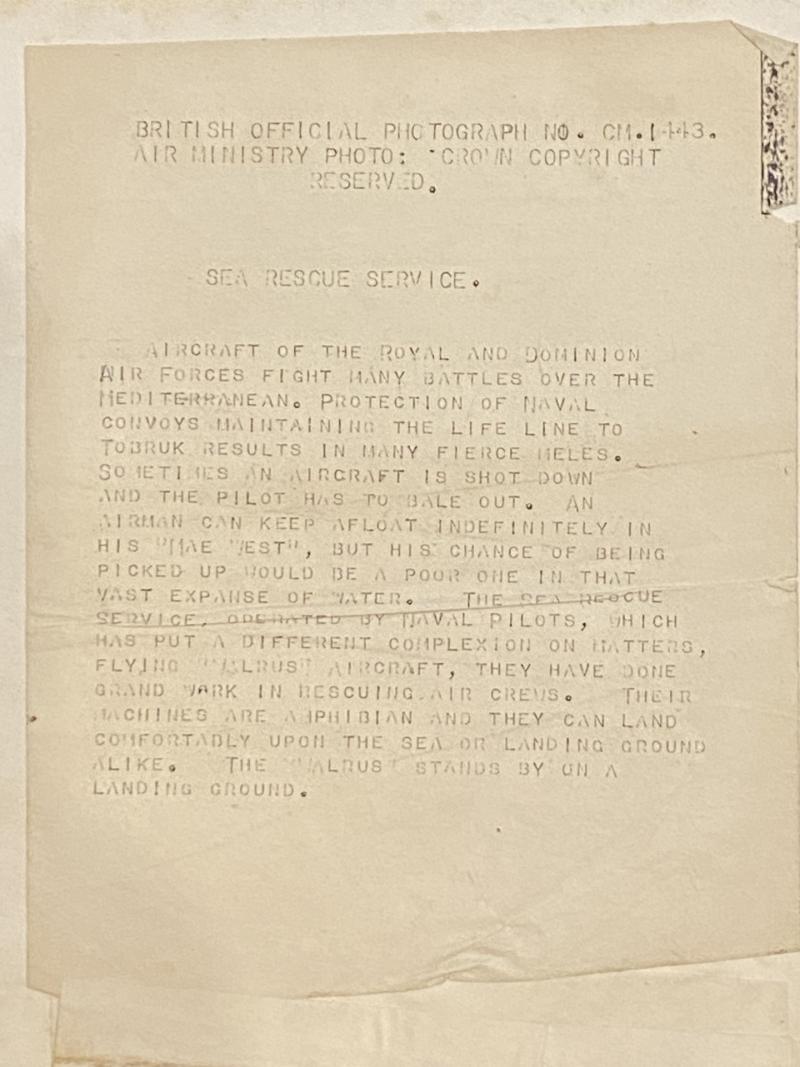 This is a Ministry of Information Photograph Division CM.443 Air Ministry Photo, of the Sea Rescue Service. Approx. 9.5" long and 7.5" wide.