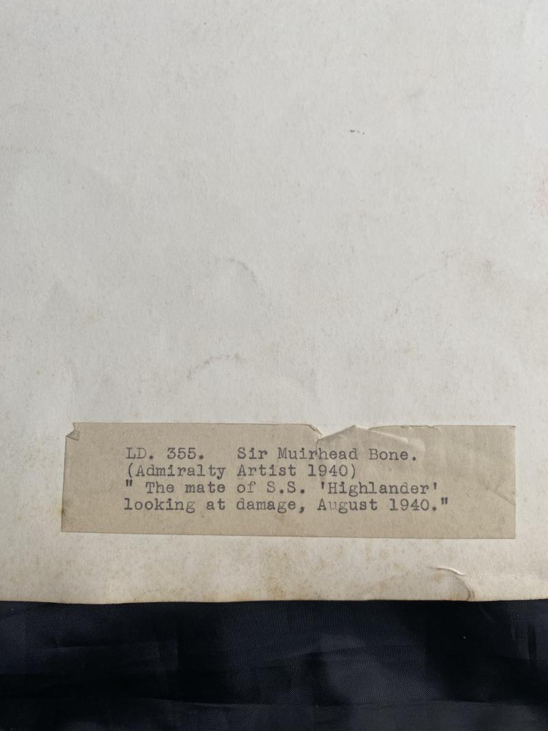 This is a LD.355. Sir Muirhead Bone. (Admiralty Artist 1940) "The mate of S.S. Highlander looking at damage, August 1940." Approx. size 20" long and 15" wide.