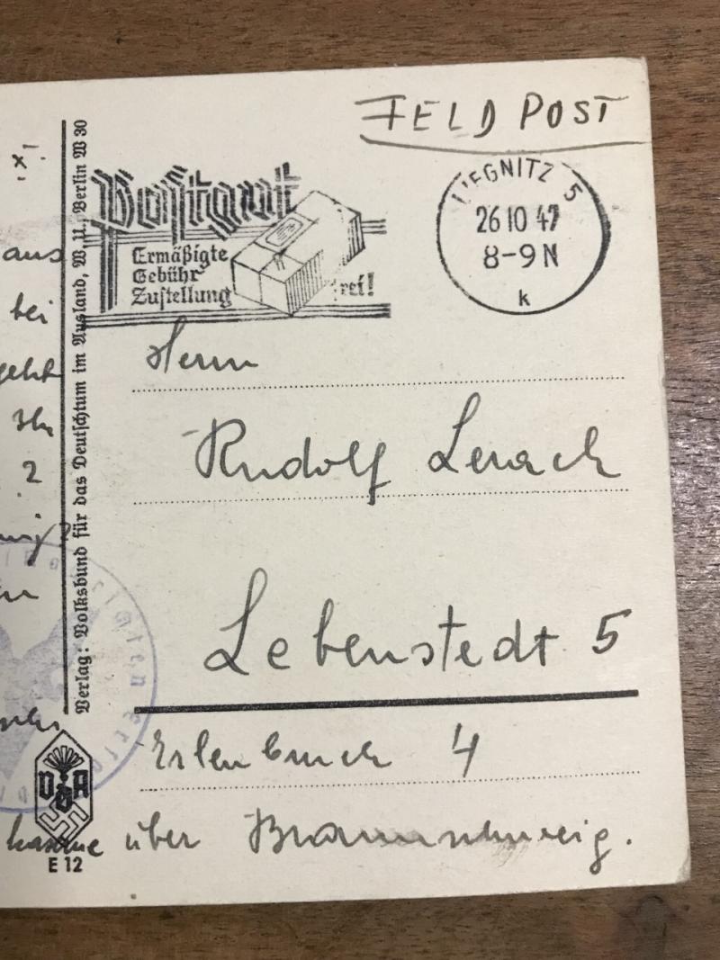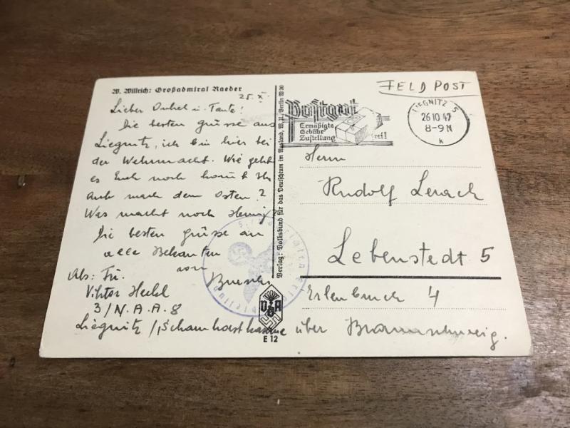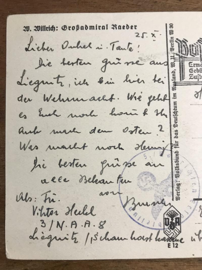 Postcard of Grand Admiral Raeder, with original writing and stamps.