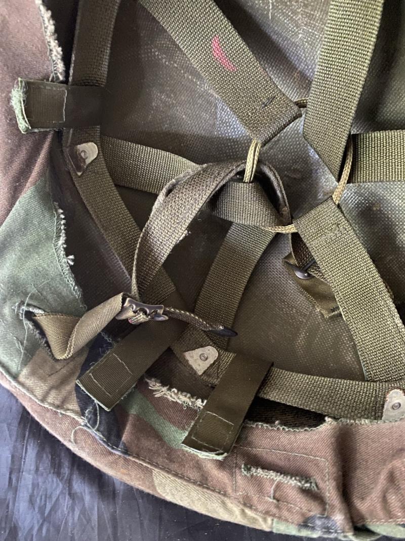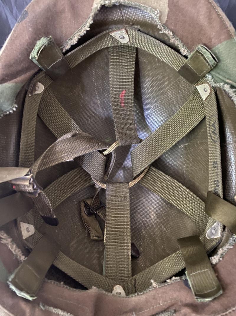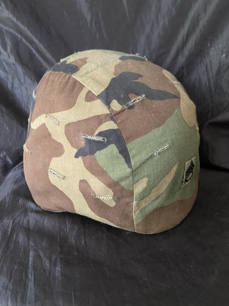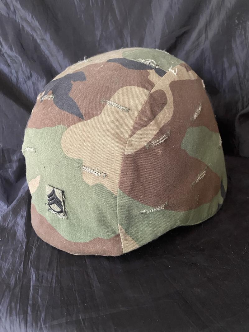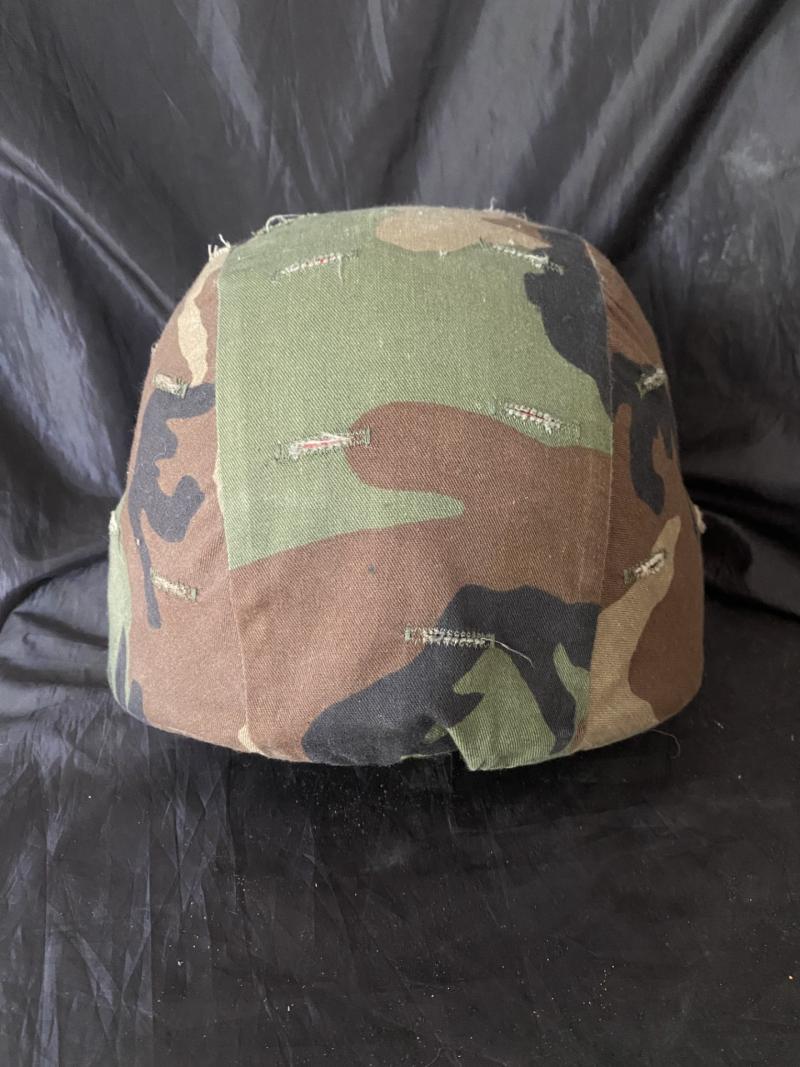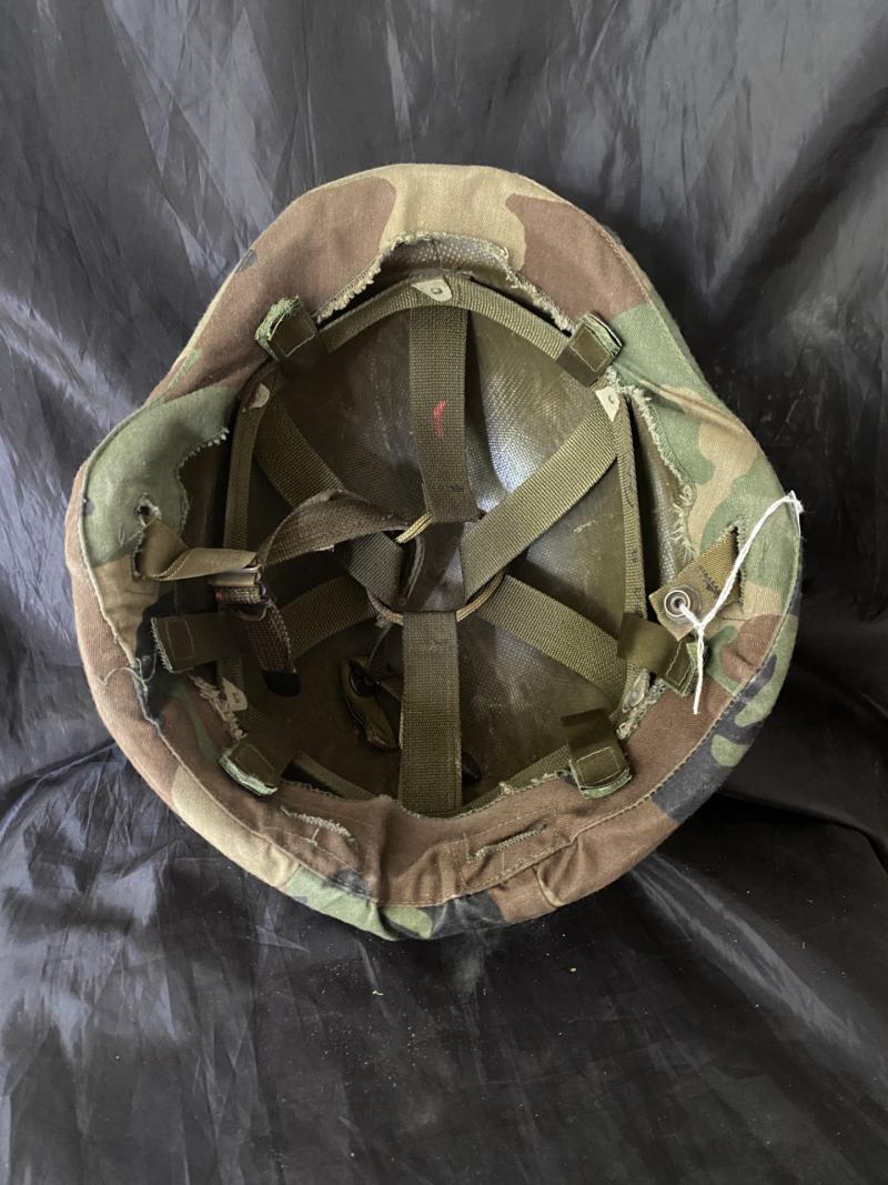This is a nice U.S. PASGT Combat helmet with a Woodland Camo cover, the liner and chin strap are in nice condition, the helmet itself has been sprayed red, a nice one to add to the collection of helmets.