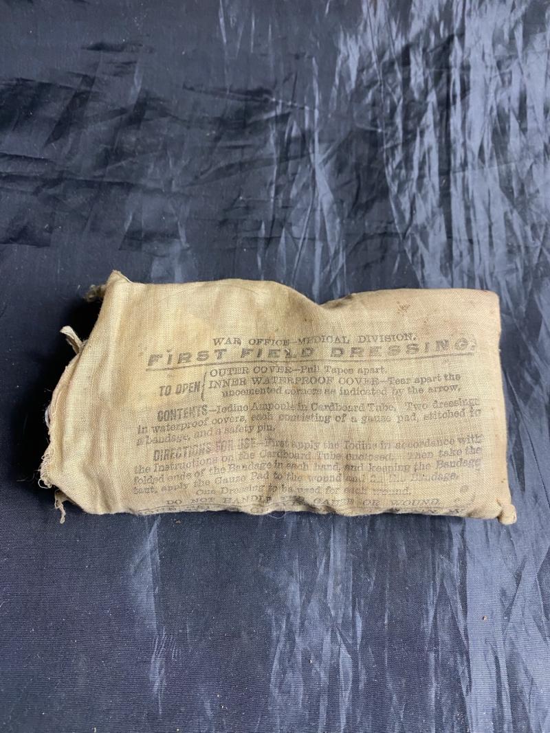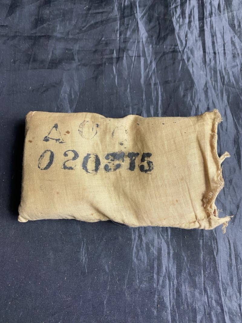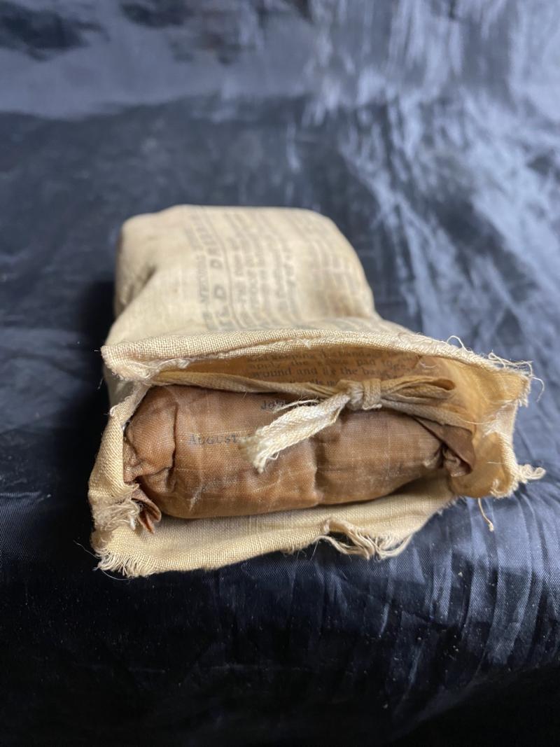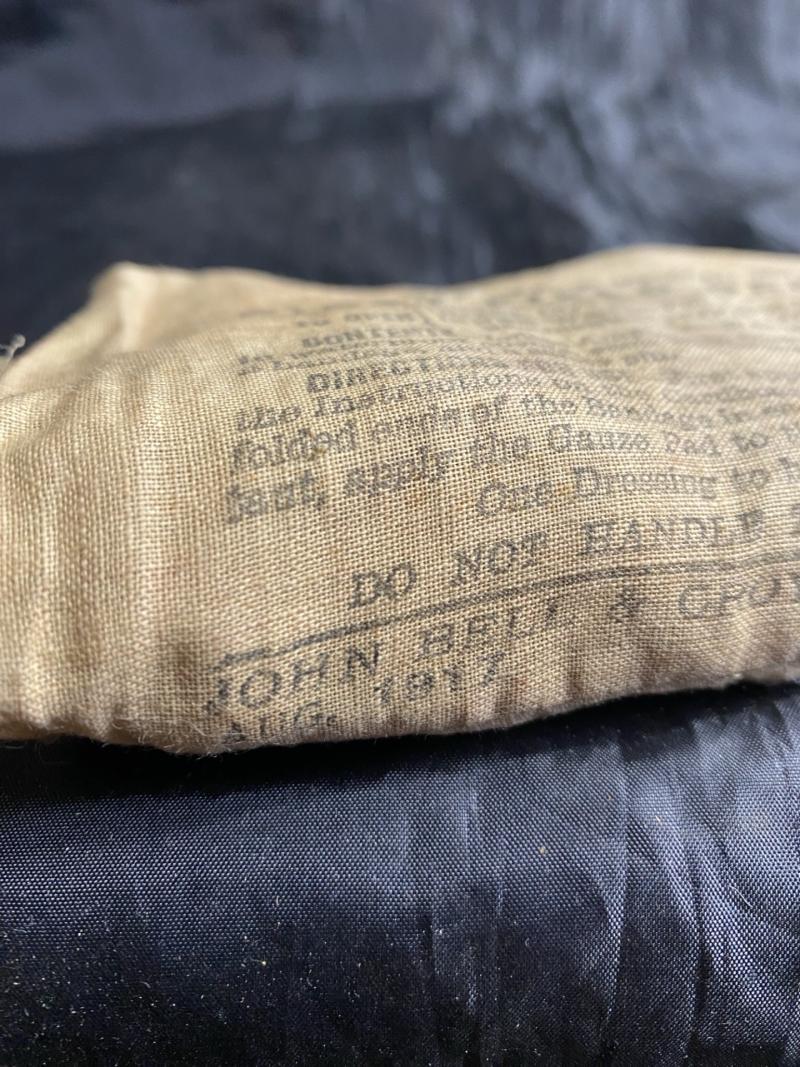 This is a WW1 BRITISH First Aid Field Dressing which was made by John Bell & Croyden Ltd, London in Aug 1917, the end has opened up but still has both dressings inside.