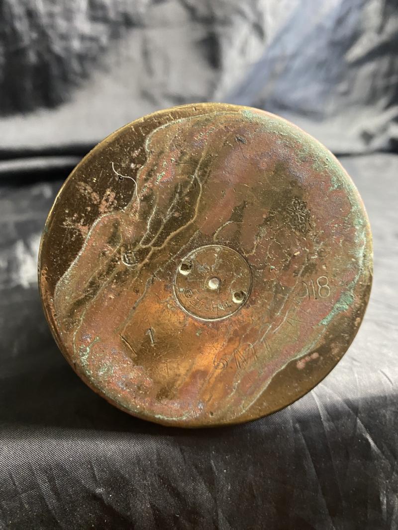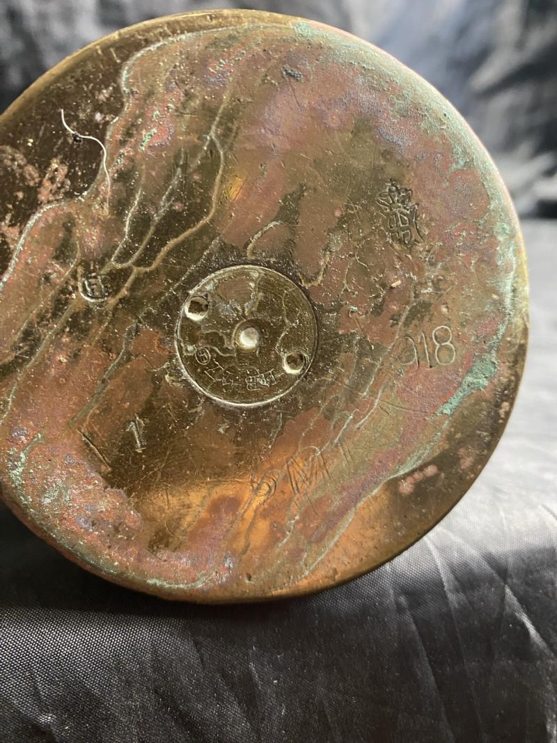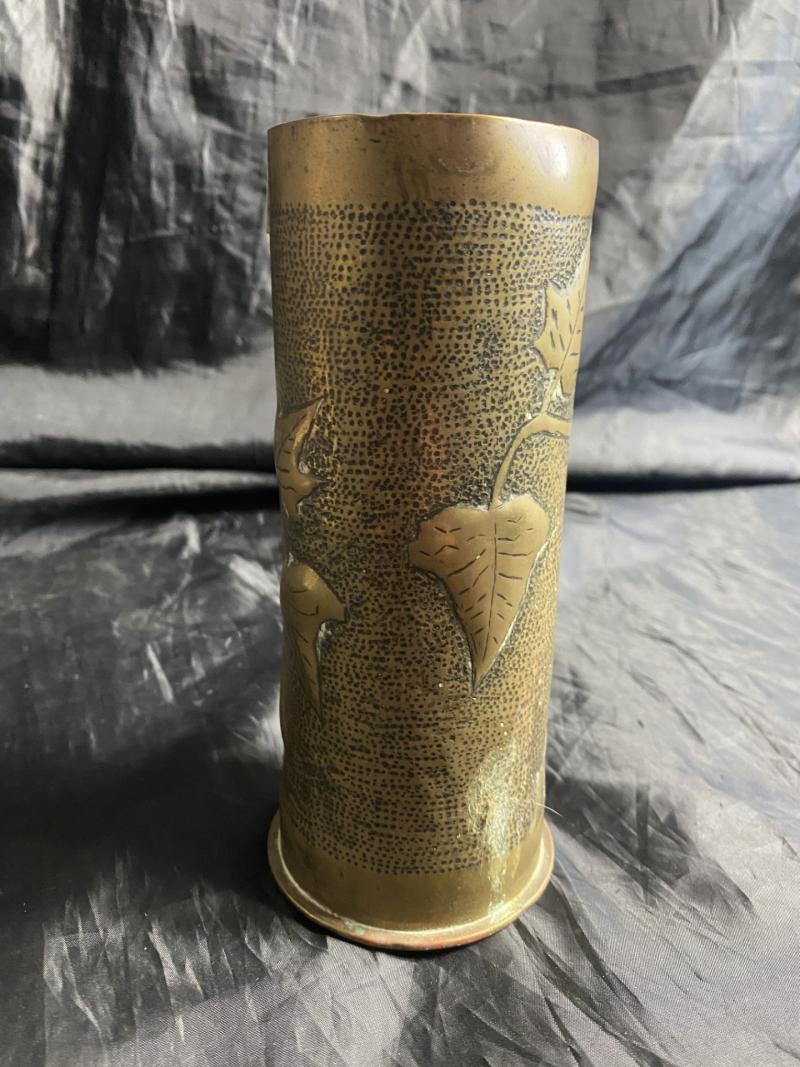 This is a nice WW1 1918 dated trench art shell case with the Ivy design, This measures Approx. 17cm tall.