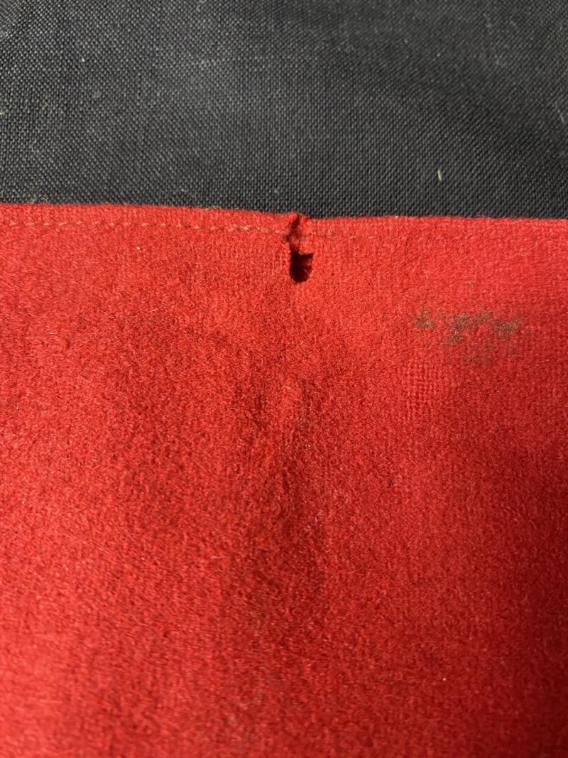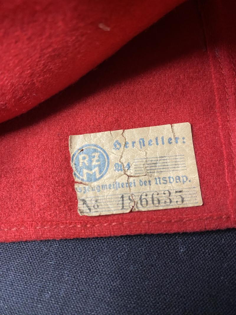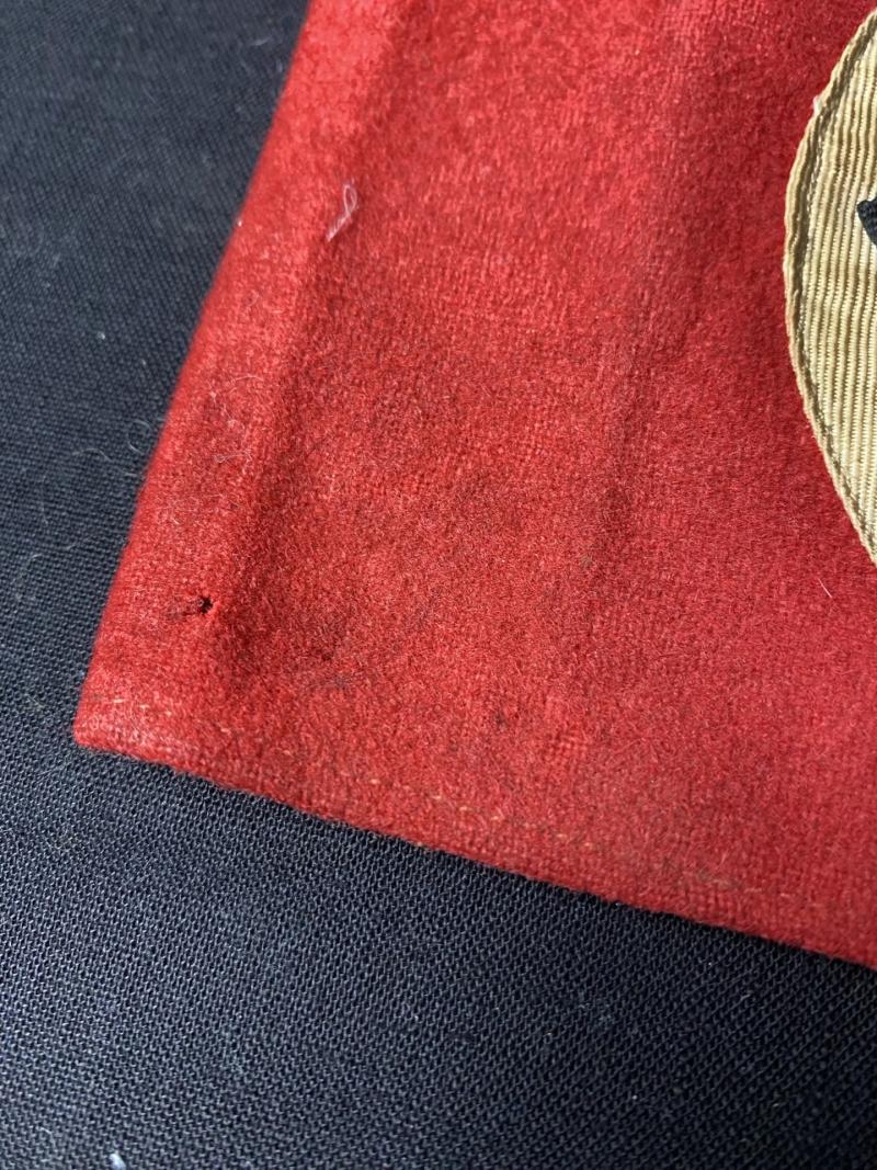 This is a nice WW2 German NSDAP Party Member's Armband which is 2 part construction in in red, then the central roundal bears a white machine-embroidered disc which is overlaid by a machine embroidered black Swastika, this one still has its original RZM label inside with the number 186635, there are a couple of small moth bites in the red wool.