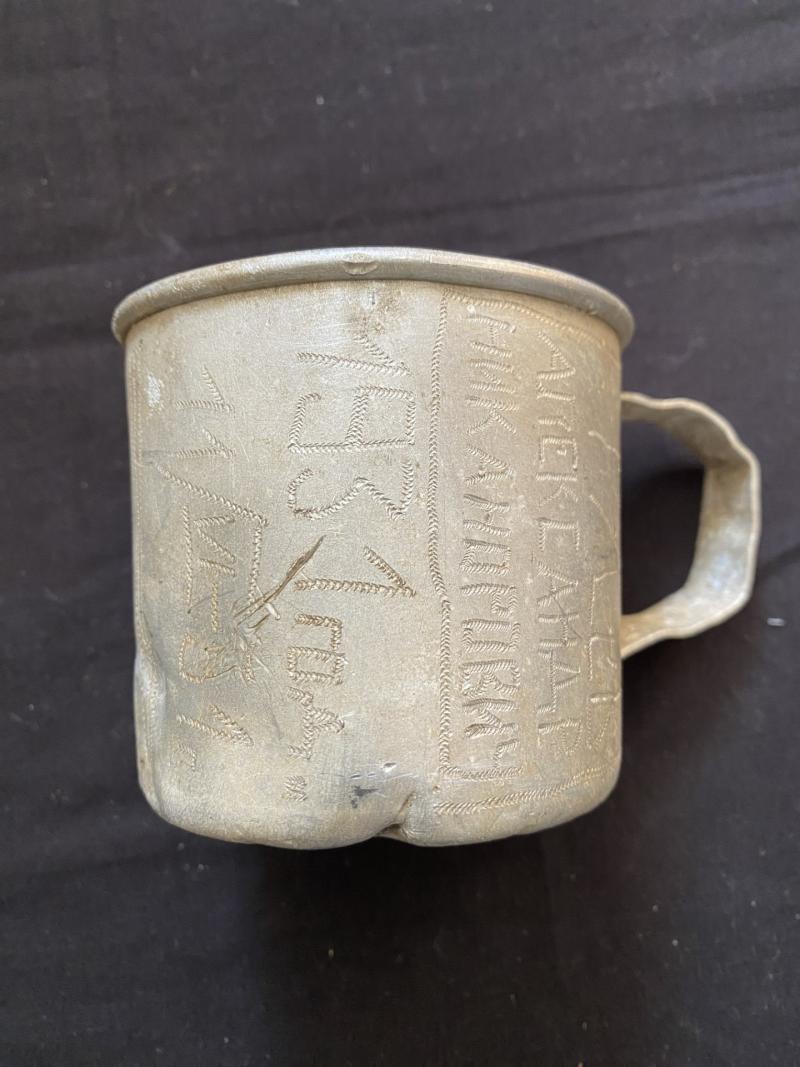 This is a Russian Aluminium mug with lots of Russian writing around the side.