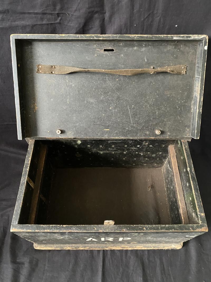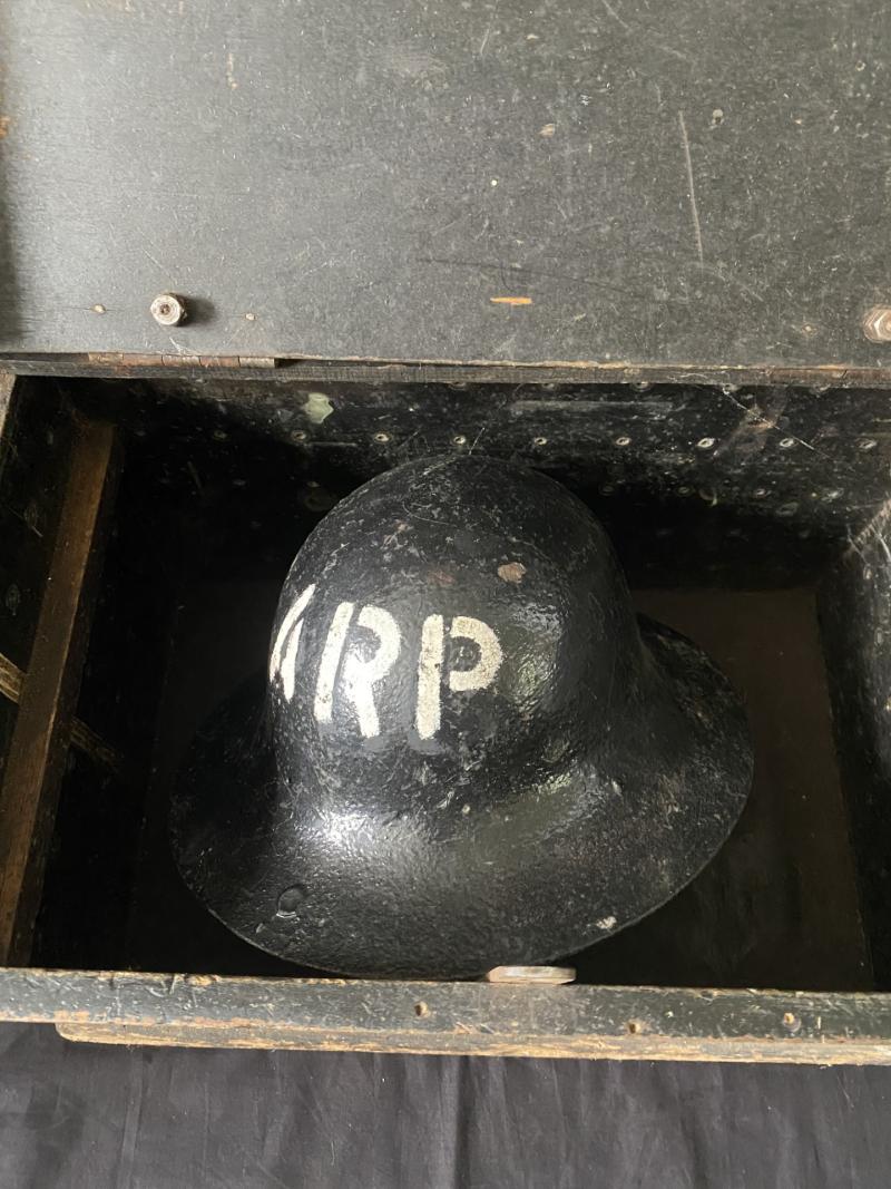 This is a nice WW2 British ARP Wooden box and helmet, the helmet is missing its liner, but would make a nice display piece, the box is in good condition.
