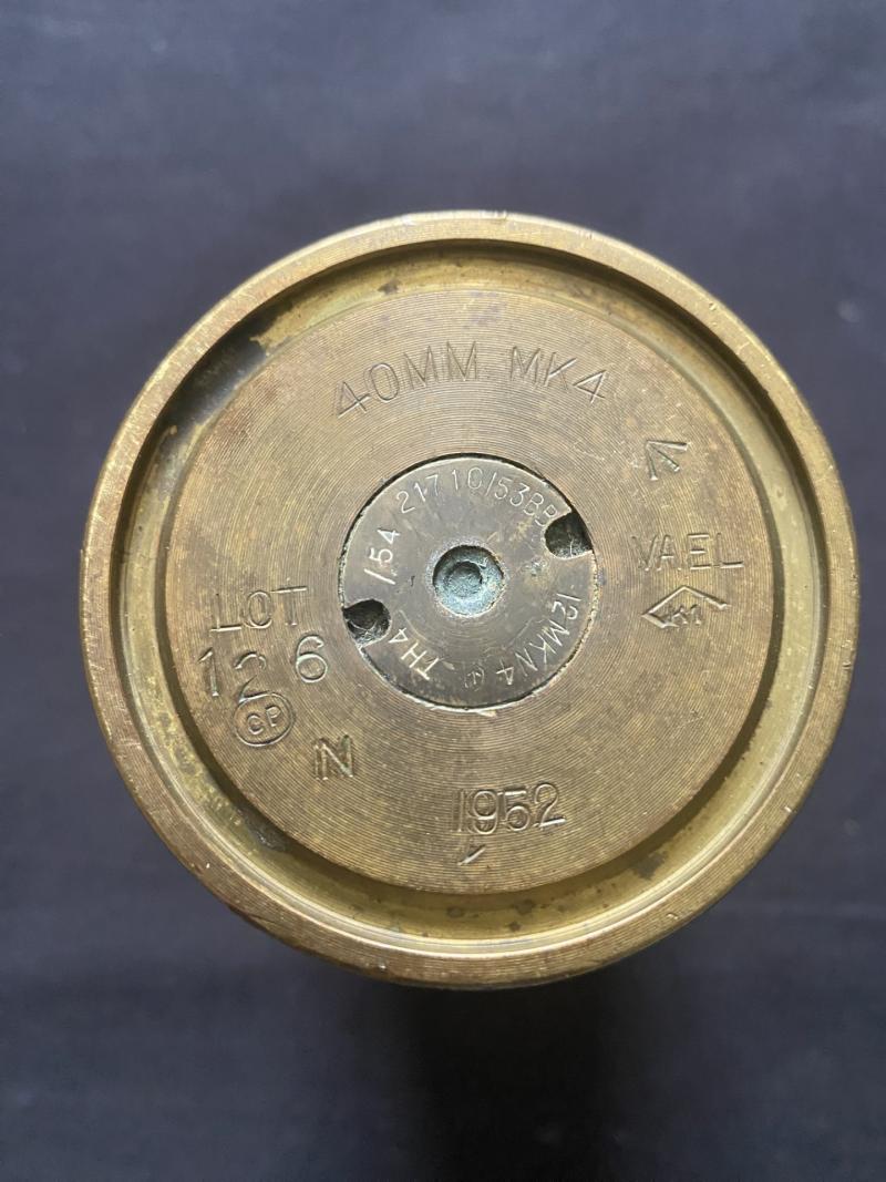 This is a British 40mm Mk.4 inert shell case which is dated 1952 and is Approx. 11cm tall. UK sales only.