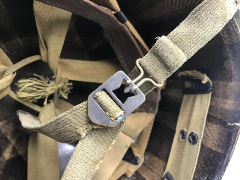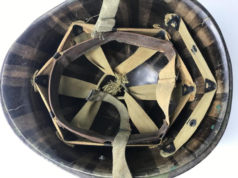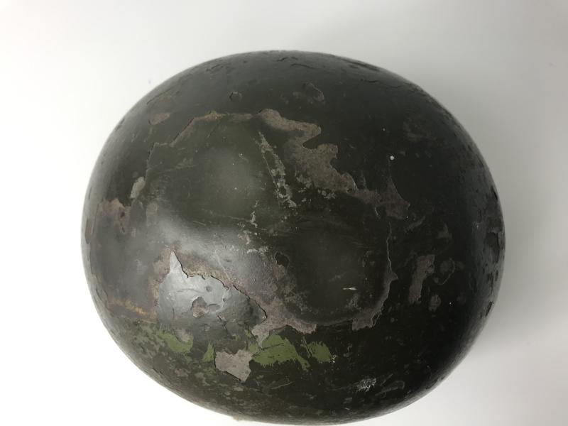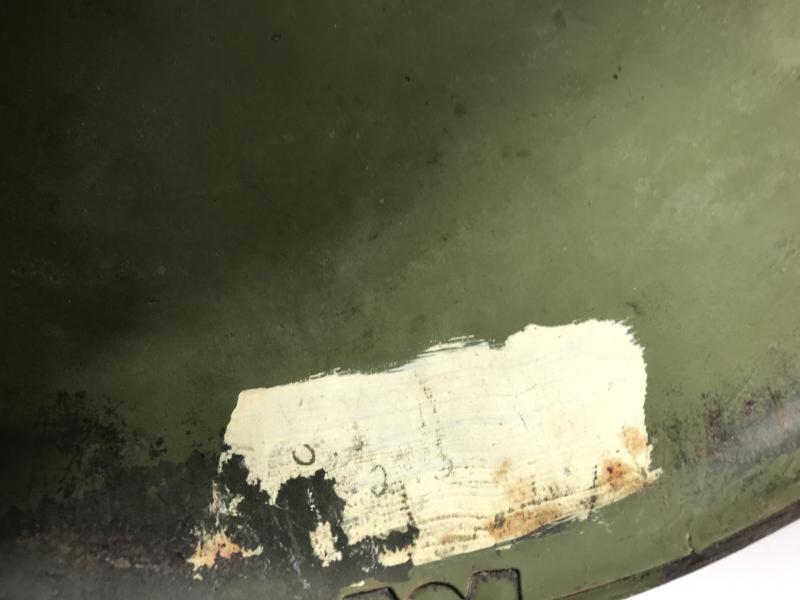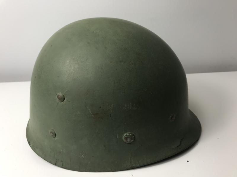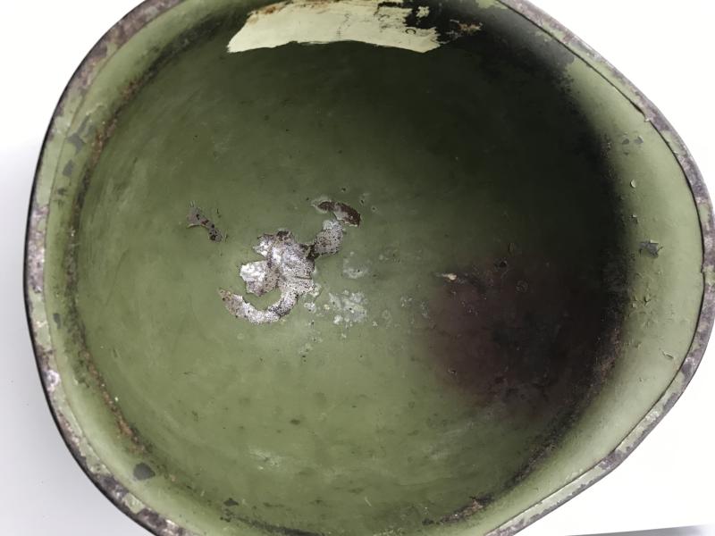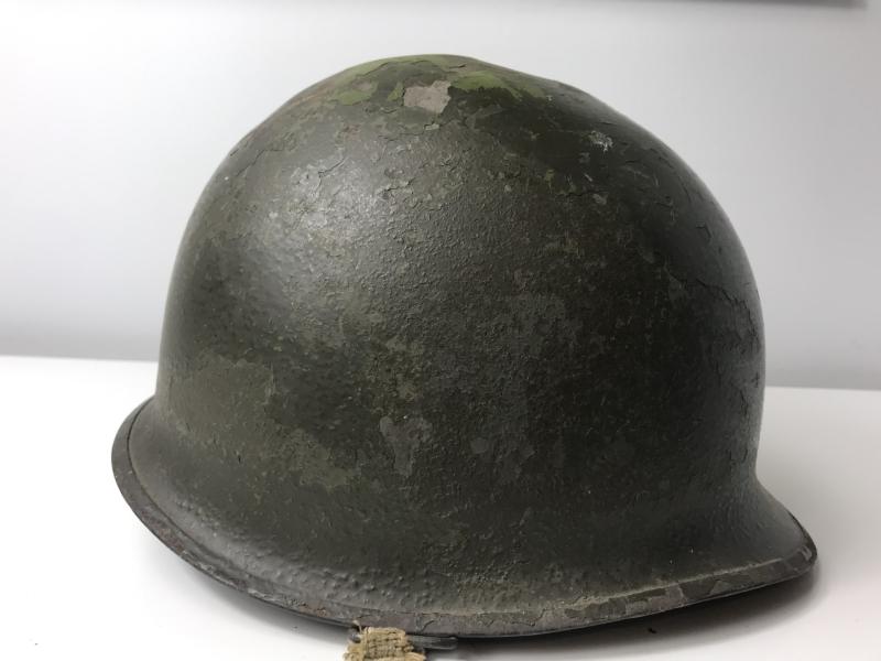 This is M1 front seamed swivel bale helmet which was in production from October 1943 to November 1944. This example actually dates to October 1944 when the stainless steel rim was changed to a manganese rim. The shell has had to coats of paint which was period applied. The chinstrap also retains brass fittings. The liner missing its chinstrap and liner neck band. It is maker marked with a letter "F" within a shield, which identifies the maker as "Firestone Tire & Rubber Company.