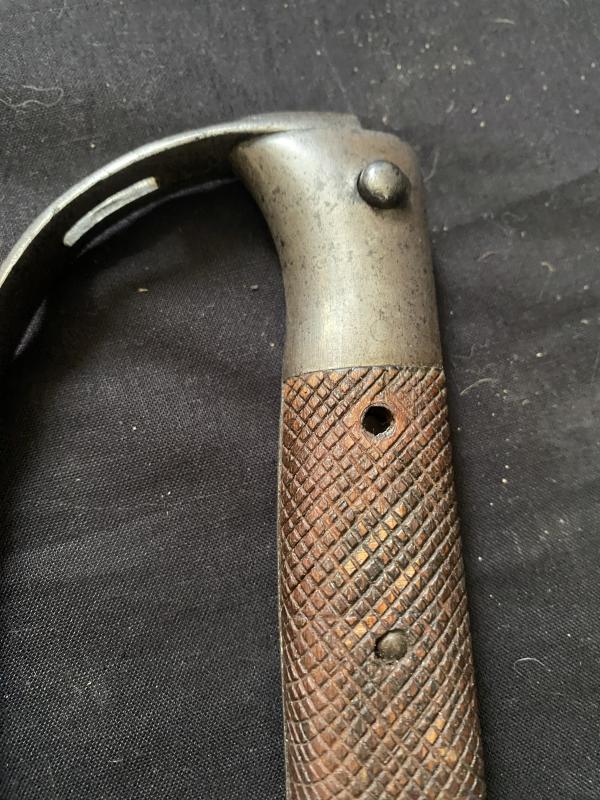 This is a British 1879 pattern Martini Henry Artillery Carbine Saw Back Sword Bayonet, this one looks to be dated 1895 with other stamping on the blade, on the spine of the handle there other stampings which potentially could be regimental markings but unsure, the blade measures 65.3cm long. This is an age restricted item. Proof of age must be provided. U.K. Sales Only.