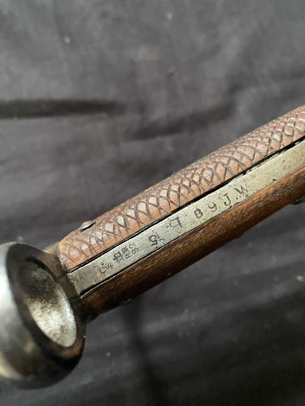 This is a fine specimen of an early production, scarce 1879 Pattern sawback bayonet, bearing stamps indicating possible reissue during the Boer War. The sawback bayonet was designed for use alongside the Martini Henry Artillery Carbine. Two bayonet patterns were initially considered, with the final approval given to a 25.75-inch blade sword bayonet featuring a sawback. RSAF Enfield spearheaded the development of both the carbine and the bayonet, initially manufacturing 5,000 of the new carbines in 1878.
