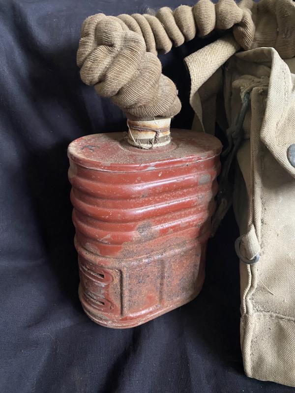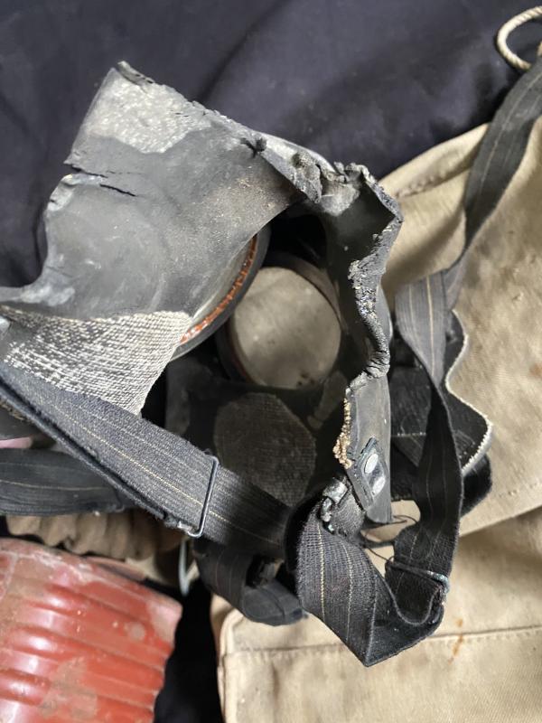 This is a WW2 German Service gas mask which in is in poor overall condition, the gas mask is torn, the filter and bag is in ok condition, the bag is named to a Capt Rolls with the number 98452, Ideal for display.