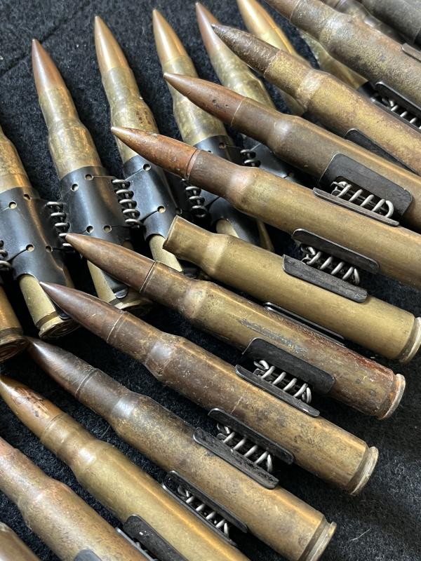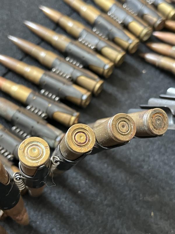 This is a belt of 48 x 7.92 inert rounds on a WW2 German belt and starter tab, one of the rounds is missing its projectile, also the rounds can vary, they will have different bases and 8 are unstruck inerts, the rounds are post War. UK sales only.