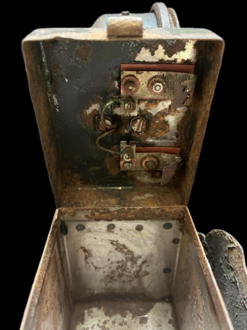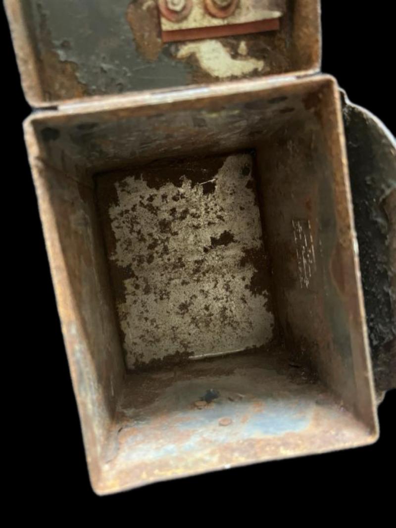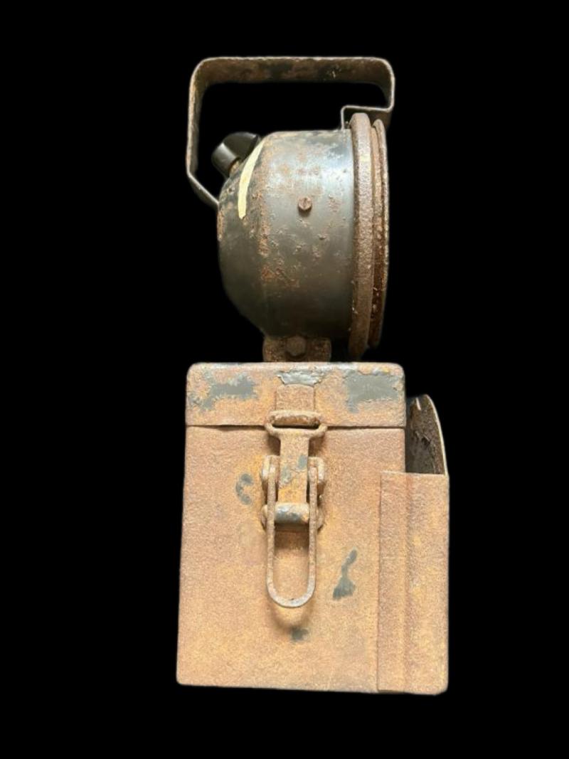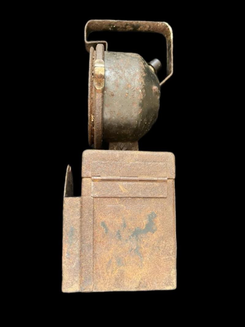 This is a German Dominit manufacturer Railway lamp which still has its battery box which opens up, the outside has seen better days but a very solid piece. This is untested.