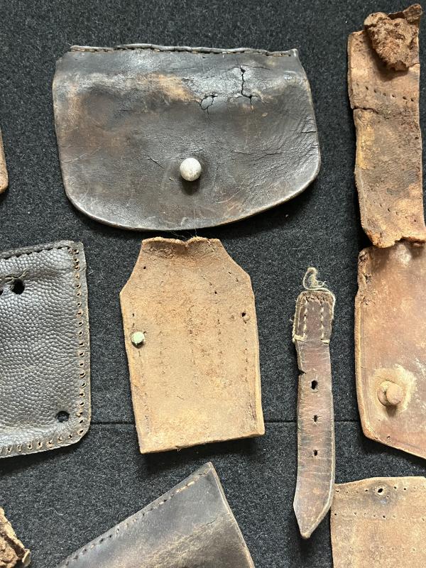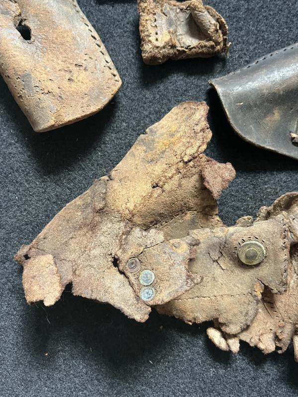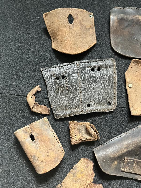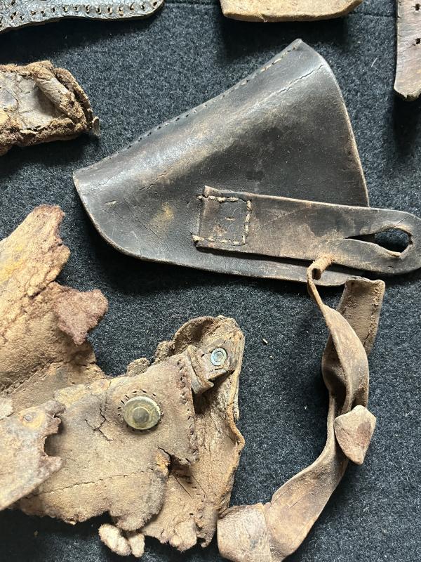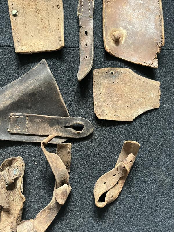 This is a assorted lot of WW2 Leather parts, most look to be German. Found in Latvia.