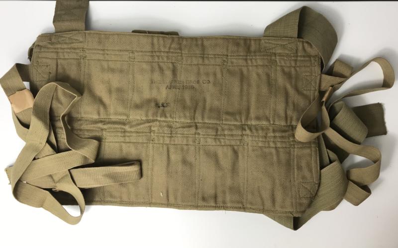 This is a unissued grenade chest carrier which was introduced in 1918 and continued to be used during WW2. This example is dated April 1918.