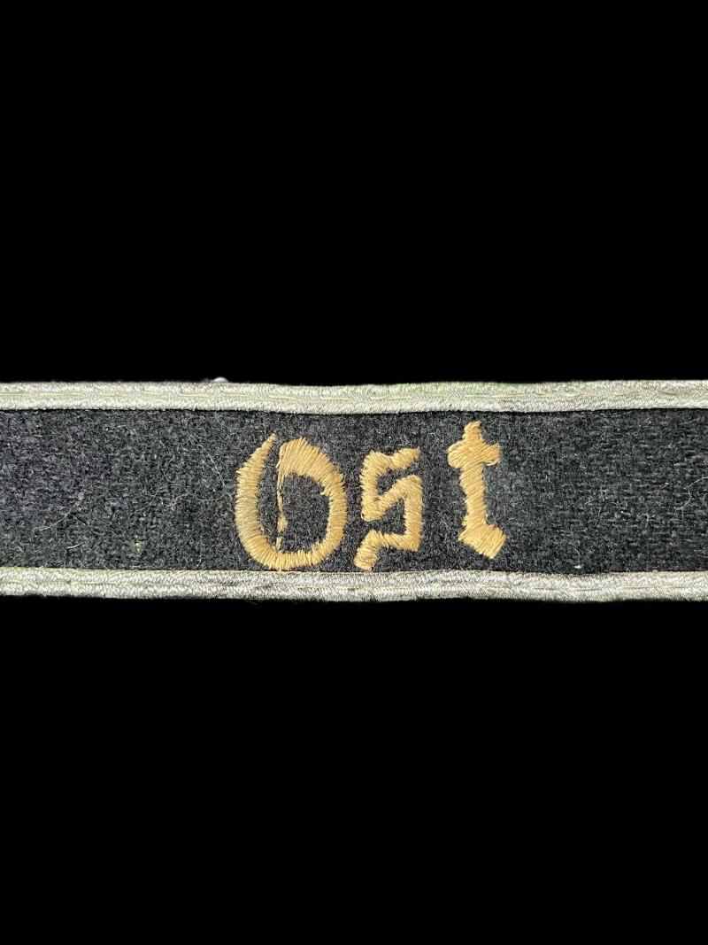 This is a reproduction WW2 German Ost cuff title. Check out our YouTube channel below. https://m.youtube.com/results?sp=mAEA&search_query=chase+militaria+