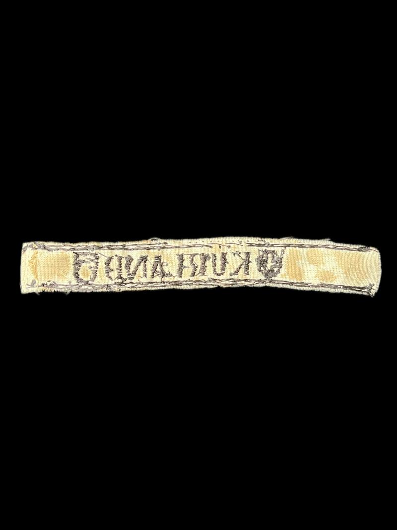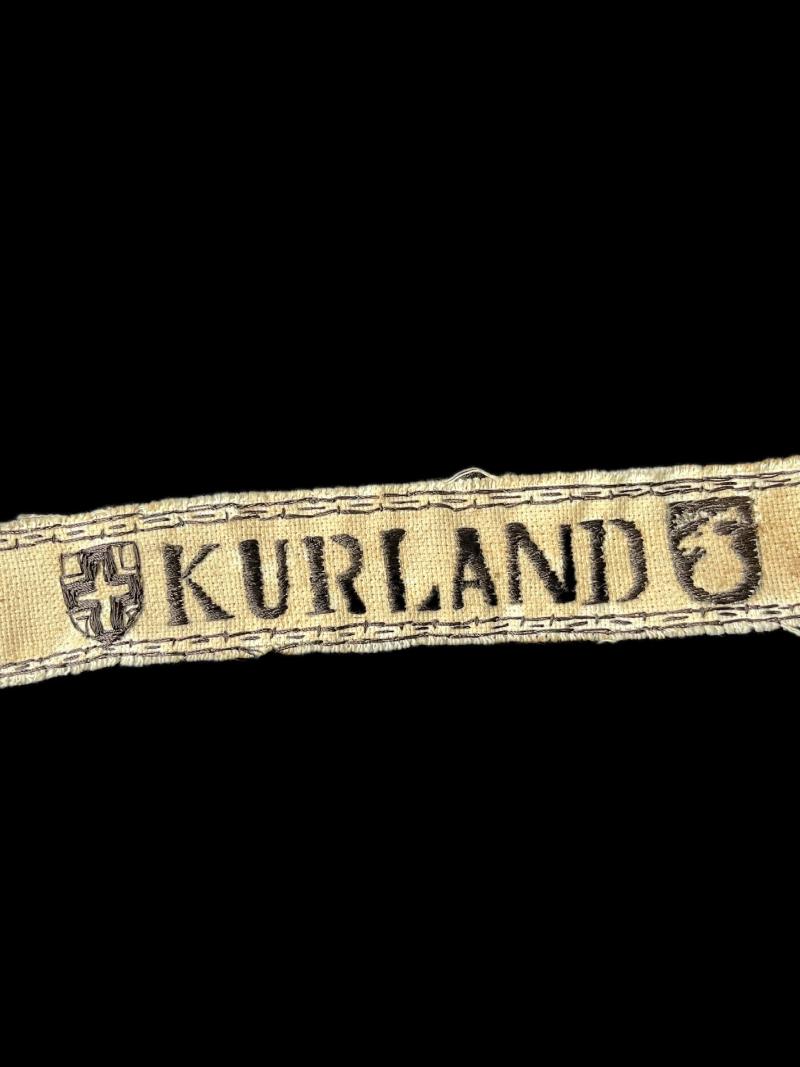 This is a reproduction WW2 German Kurland cuff title. Check out our YouTube channel below. https://m.youtube.com/results?sp=mAEA&search_query=chase+militaria+