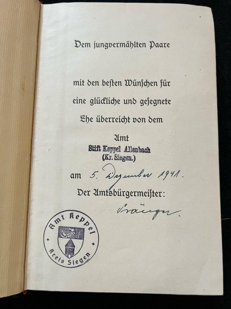 This is a nice 1941 dated Wedding edition Mein Kampf by Adolf Hitler, this one is signed by the Mayor of the Siegen District.