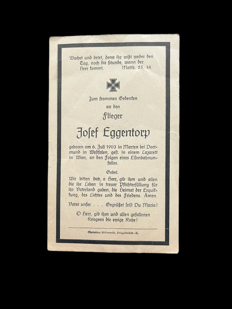 This is a WW2 German death card to a Aviator Josef Eggentorp. Check out our YouTube channel below. https://m.youtube.com/results?sp=mAEA&search_query=chase+militaria+