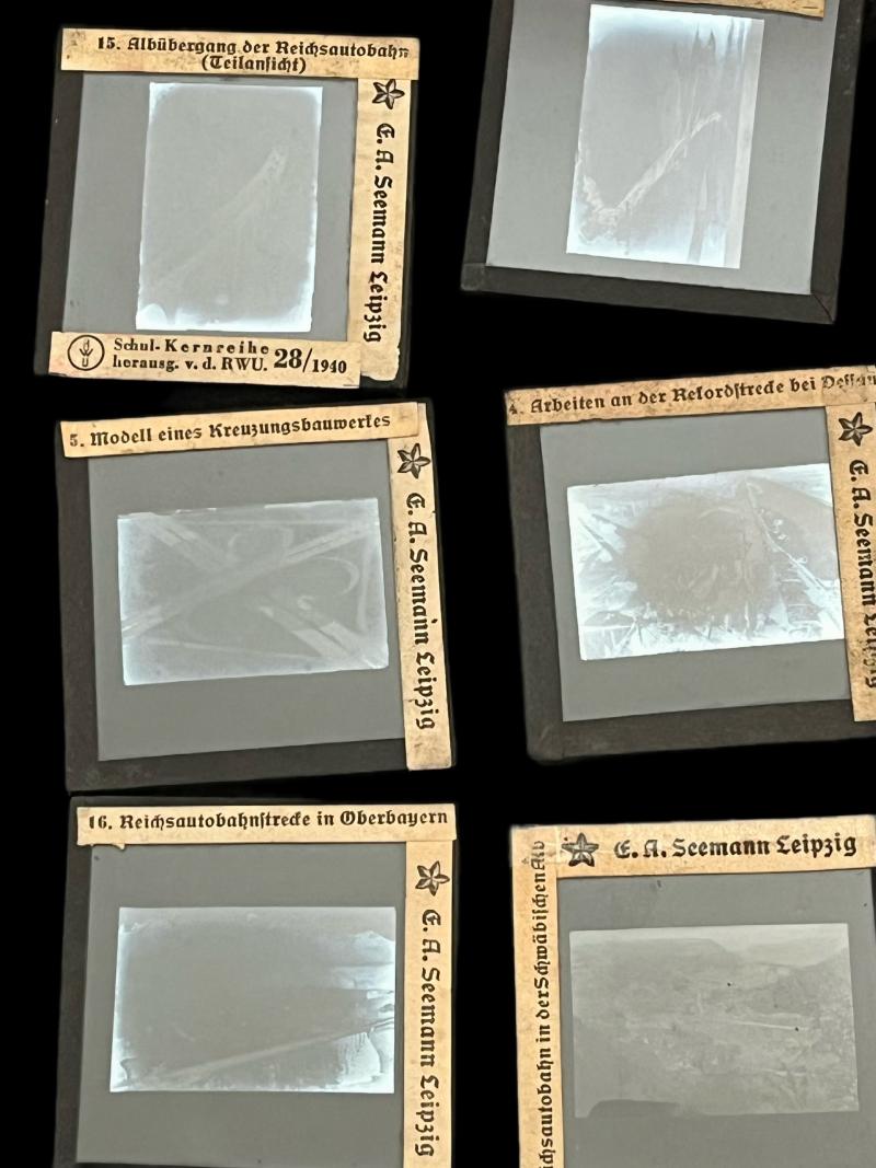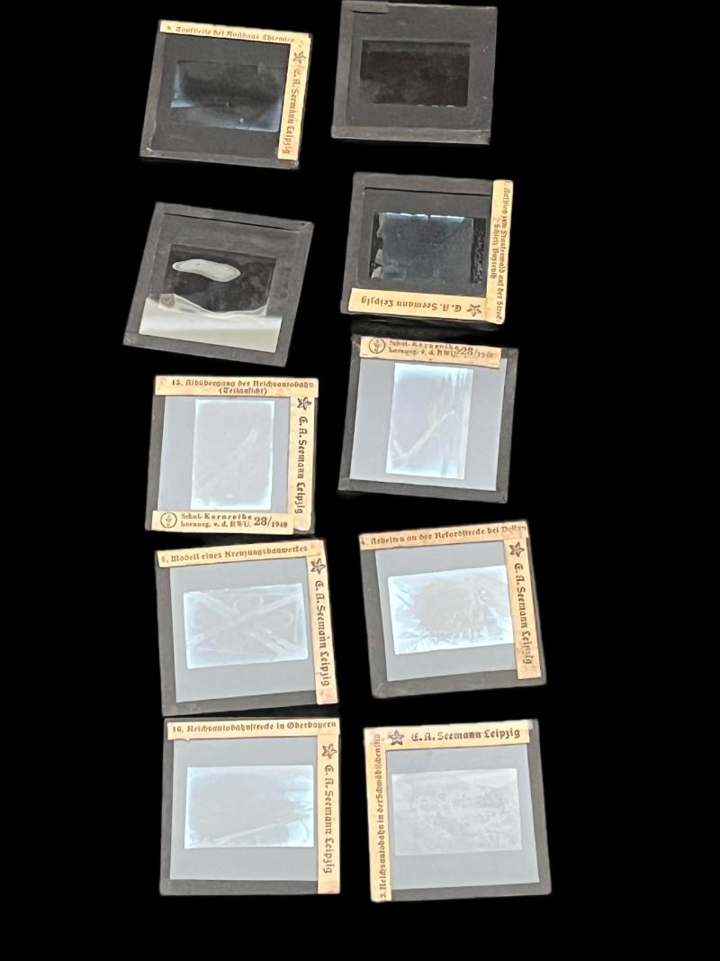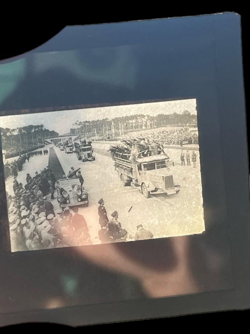 This is a set of 10 x WW2 German Photo slides, although most are just of Autobahns and infrastructure, there is one where you can see Hitler in his car Saluting as vehicles drive by.