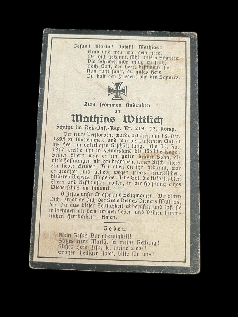 This is a WW1 German death card to Mathias Wittlich Check out our YouTube channel below. https://m.youtube.com/results?sp=mAEA&search_query=chase+militaria+